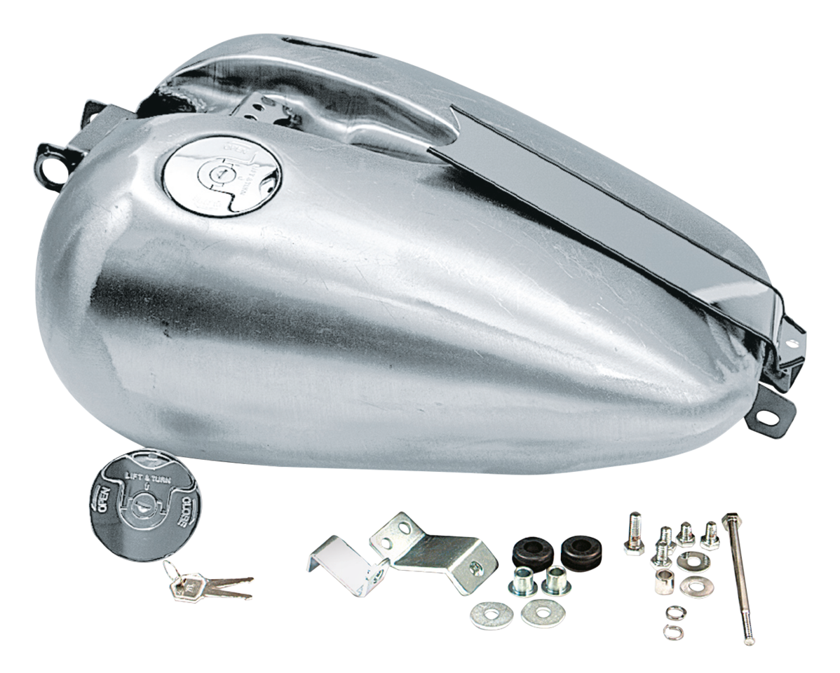 They have changed the mountings of this very popular tank to fit 1991 thru 2005 carburetor equipped Dyna. It comes with a show-chromed dash panel to get the "Split Tank" Fat Bob look. The Dyna Quick Bob includes a bracket to accept the OEM FXDWG dash as well as the Old Style 2 or 3 light FL dashes with large style speedometer. Available with Screw-In gas caps as well as the Flush mount Quick Cam lockable gas cap (flush gas caps are included with the tank). Tank has extra large 3.5 gallon capacity (13,2L.). Hardware kits are separately available.