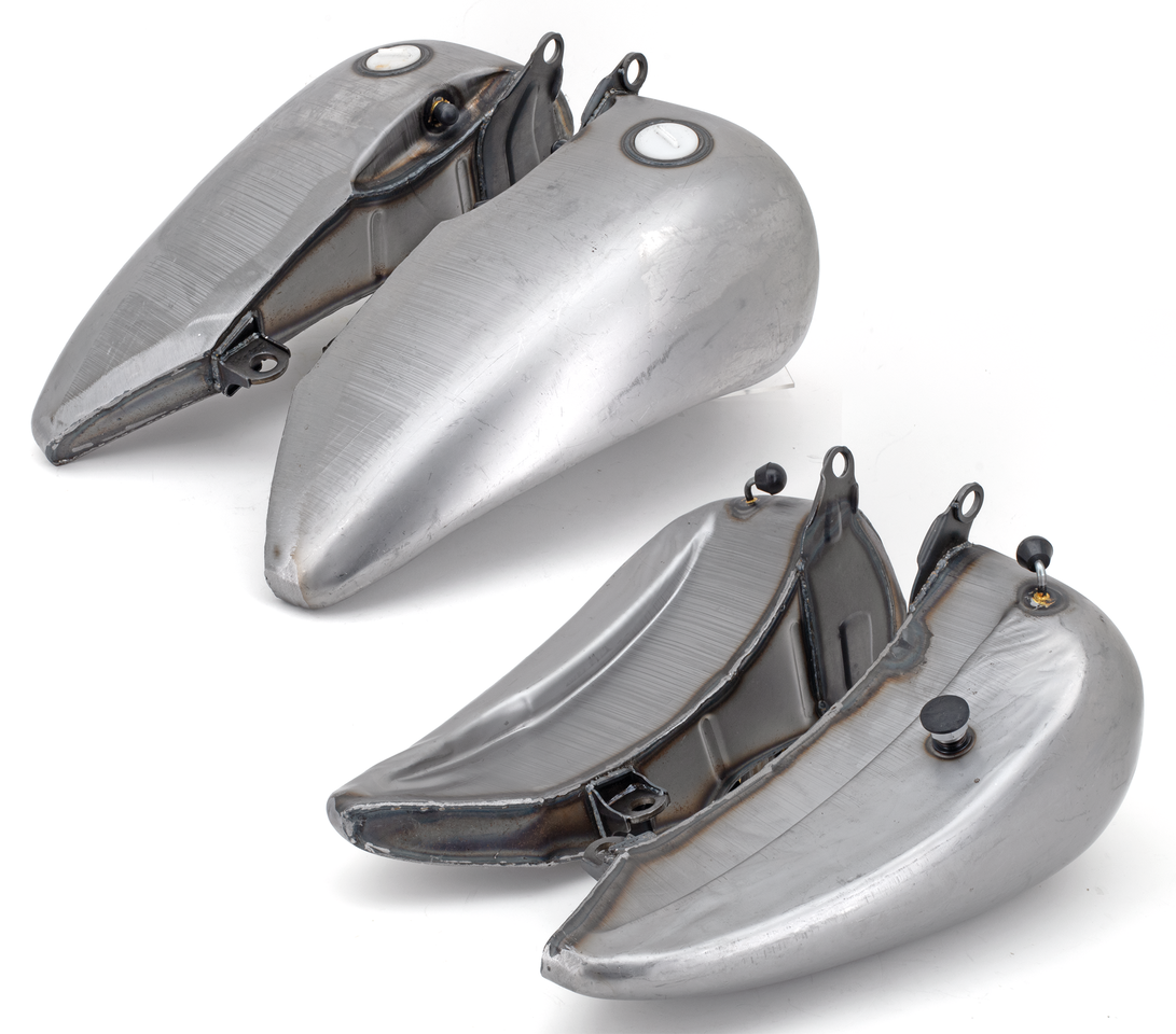 These split stretched gas tanks will give your Softail that long, slippery stretched look associated with the top Custom bike builders. The stretched section is not a weld-on piece but an actual part of the tank. The exclusive stretched Zodiac tanks are the only one-piece steel tank available. Its design will give your bike smooth flowing lines and a very classy look. Due to the sleek design a narrow seat (like our Silhouette seats) must be used, stock seat may not fit. Fits all Softail models 1984 thru 1999. Available with Screw-In type gas caps, Quick Cam lockable flush or a set of our small chrome plated aluminum Aero-style gas caps. Gas caps are separately available.