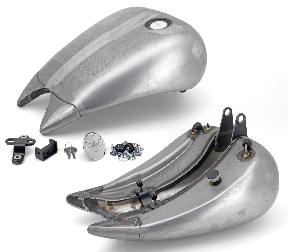These one piece stretched smooth top gas tanks will give your Softail the long, extra slippery stretched look and flowing lines which is very popular with today's top Custom bike builders. These tanks are made by welding a 2 inch extension to our stretched tanks making them in total 4 inch (10 cm) longer than stock. The extra stretch provides that special slim look. The rear of the tank has a cut out to match with most narrow seats, such as our Silhouette seats. Fits Softail models 1984 thru 1999. Tanks are available with four different cap styles and hold approx. 4.2 gallon of fuel (15,9L.).