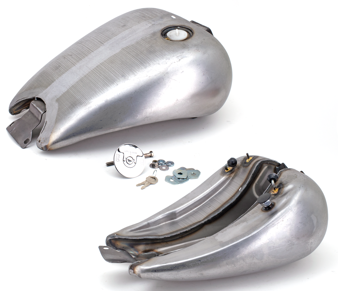 This one piece stretched smooth top gas tank will give your FXR the long, slippery stretched look and flowing lines as found in our other stretched tanks. The stretched section is not a weld-on part but an integral part of the tank and has a seat pocket to match with most narrow seats. Tank will hold approx. 4.2 gallon of fuel (15,9L.) and is available with single or dual Screw-In type gas caps, single or dual Quick Cam lockable flush mount gas caps, Aero-style gas cap, and with the newest Pop-Up gas cap in a paintable and a chrome finish.