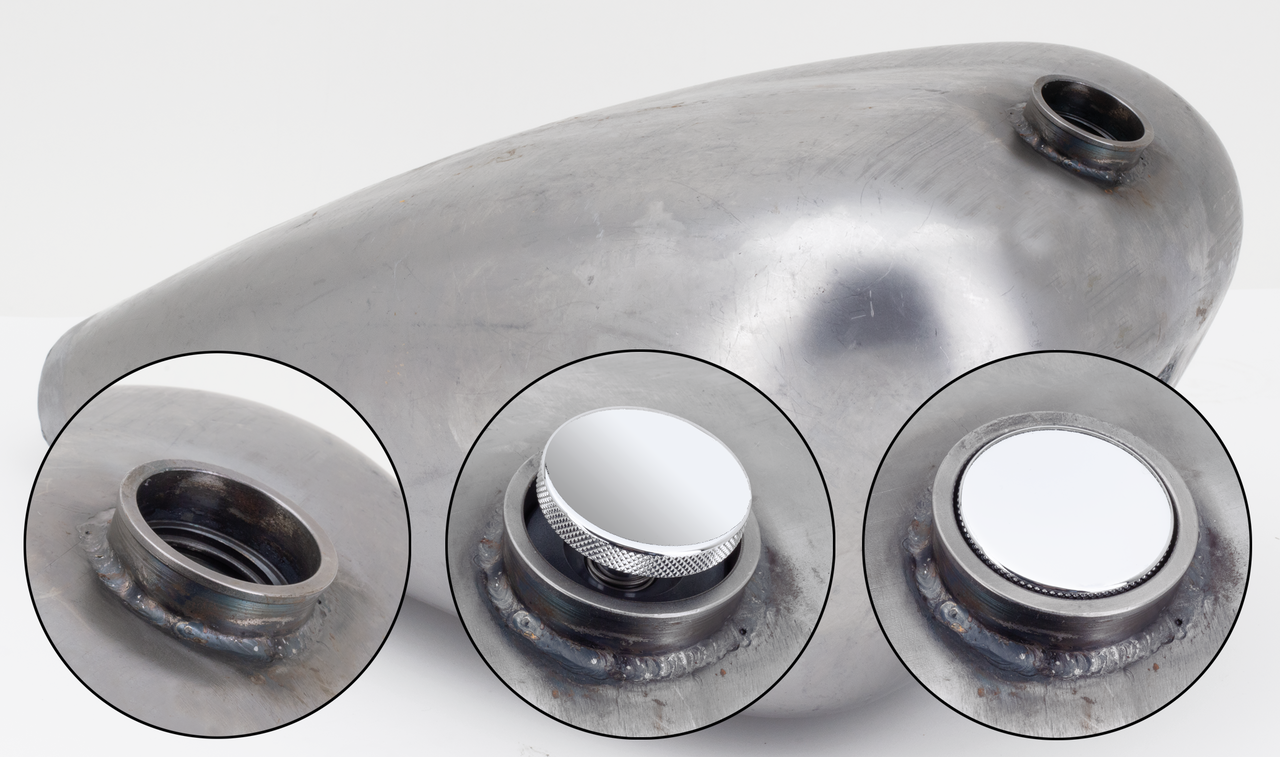 A number of great designs in our Image Series are these stretched chopper tanks. Smooth looking and enhancing the lines of our High Neck Chopper frames. Also look great on any frame with stretched downtubes and 3" or more stretch in the backbone. Tanks come with weld-on mounting brackets, which are recessed in the bottom of the tank for a smooth hidden look. The rear of these tanks are tapped 1/8"-27 NPT to take a fuel crossover line, and must be used with a 13/16" (22mm) petcock. Tanks are available complete with chrome pop-up gas cap in flush mount or raised bung style, or as a screw-in style tank without gas cap.
