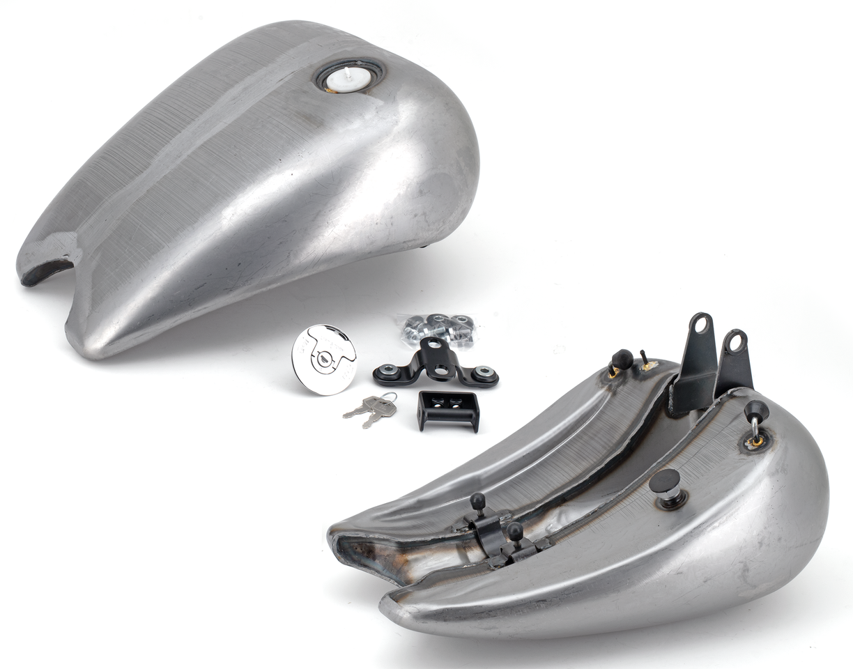 This one piece stretched gas tank will give your Softail the long, slippery stretched look associated with the top Custom bike builders. The stretched section is not a weld-on piece but an integral part of the tank. The exclusive Zodiac stretched tanks are the only one piece steel tank available. Its design will give your bike smooth, flowing lines and a very classy look. Stretched Softail tanks are available with dual and single screw type gas cap, dual or single, "Quick-Lock" lockable gas cap as well as a tank with a single cap aircraft style Aero gas gap and with the latest style Pop-Up gas cap in a paintable or chrome finish. Due to the sleek design a narrow seat (like our Silhouette seats) must be used, it can't be used with the stock seat. Fits Softail models 1984 thru 1999. Tanks hold approx. 4.2 gallon fuel (15,9L.).