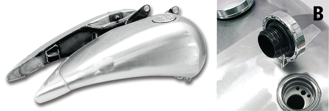 These two piece stretched gas tanks will give an extra long, extra slippery stretched look. Tanks are made by welding a 2" extension to our stretched tanks making them in total 4" (10 cm) longer than the stock tank. The extra stretch provides that special slim look. The rear of the tank has a cut out to match with most narrow seats, such as our Silhouette seats. Fits Softail models 1984 thru 1999. Tanks are available in three different cap styles and two sizes, 4.2 gallon (15.9L.) and 5.4 gallon (20,4L.).