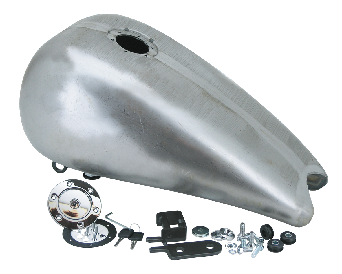 This one-piece 3" stretched gas tank has a smooth top and includes a single midi aero locking gas cap. This tank gives your bike the same kind of styling as with the aluminum gas tanks, but at a much more economical price. The rear of the tank has a cut-out to match with most narrow seats. Tank holds approx. 3.8 gallon (14,4L.)