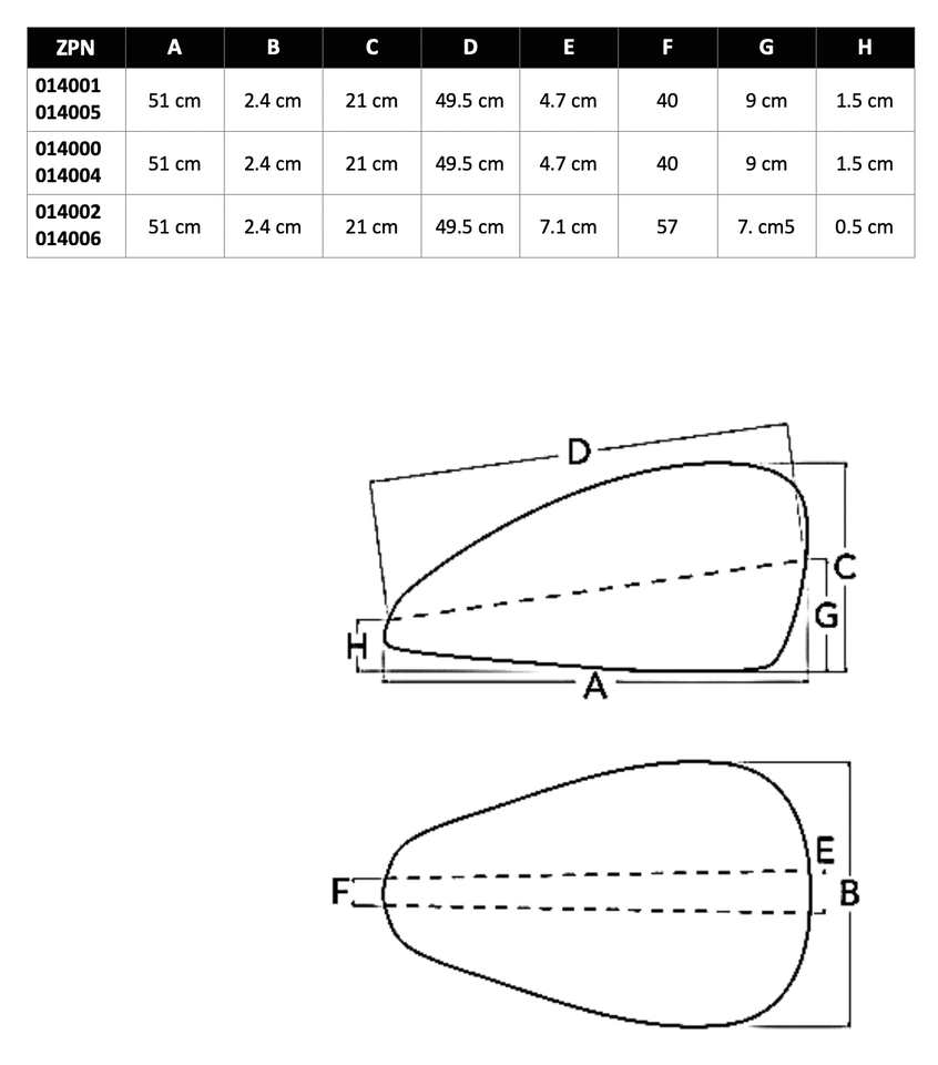 Narrowed and tapered version of our popular Legacy gas tanks. They are 9" (23 cm) wide in the front and only 3 1/2" (9 cm) wide in the rear and hold approx. 2.75 US fluid Gallon (10.4 liter). They take stock style screw-in gas caps and a set of old school rubber knee pads is available separately.