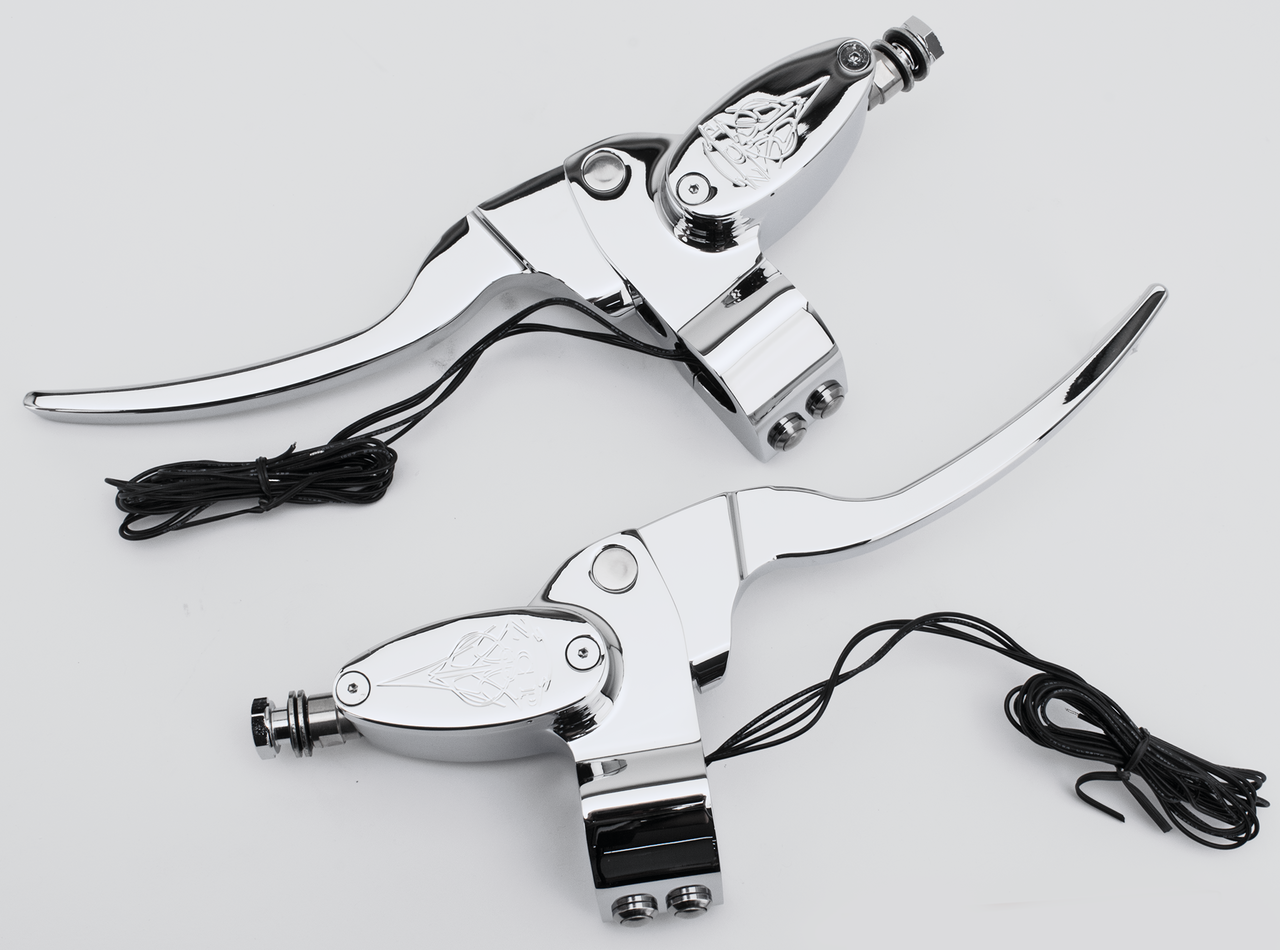 Not just another custom product but a high quality custom handlebar control kit that can compete on the market. There are more on the market but none of them offer such a high quality in design and finish for such an affordable price. CNC machined from solid billet aluminum with a tribal engraved in the master cylinder top cover these controls do very well on any custom bike. Kits come complete with handlebar brake master cylinder, clutch lever assembly for cable operated clutch or handlebar clutch master cylinder and push button switches. Brake master cylinders are 5/8" bore, a bore size that works well with most single and dual disc brakes. Clutch master cylinders are 9/16" bore, a bore size that works well with most hydraulic clutch slave cylinders. Kits are available in high luster polished, black coated or chrome plated.