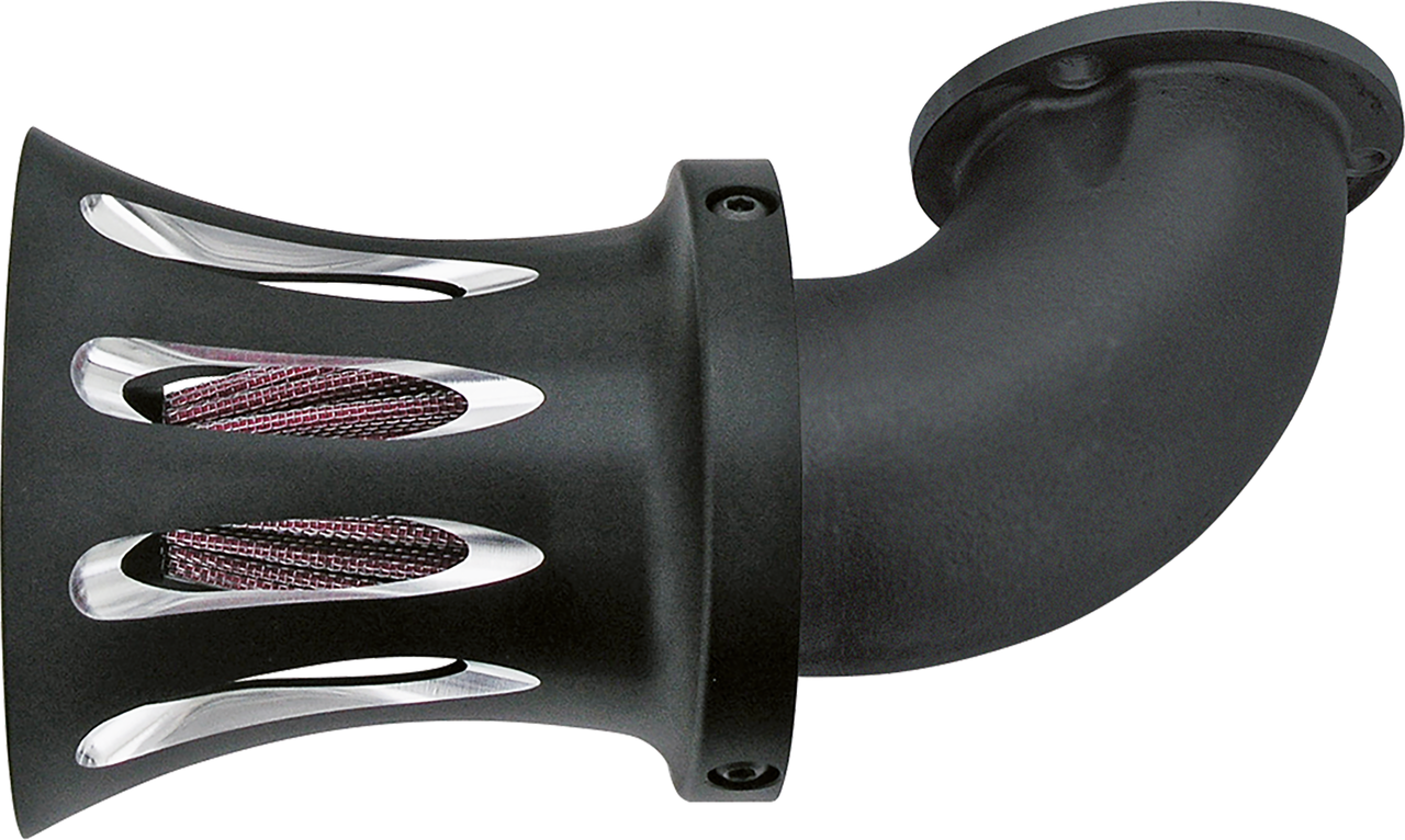 A new and exciting design from Zodiac are these Voronoi HP velocity stacks. Contrary to most other velocity stacks the Voronoi has a true air filter element incorporated in the 4" (10 cm) diameter throat. Consequently the Voronoi not only looks great and increases engine power, it also prevents road grime and dirt from entering your expensive engine. These velocity stacks are made from billet aluminum and CNC precision cut, then hand polished and chromed or black anodized to perfection. The black version is then raw cut to enhance its appearance. Available in straight or aggresive looking "tilt forward" design that comes with a cast elbow in a matching chrome or black finish. Installation requires the separate purchase of an adaptor bracket kit as listed below.