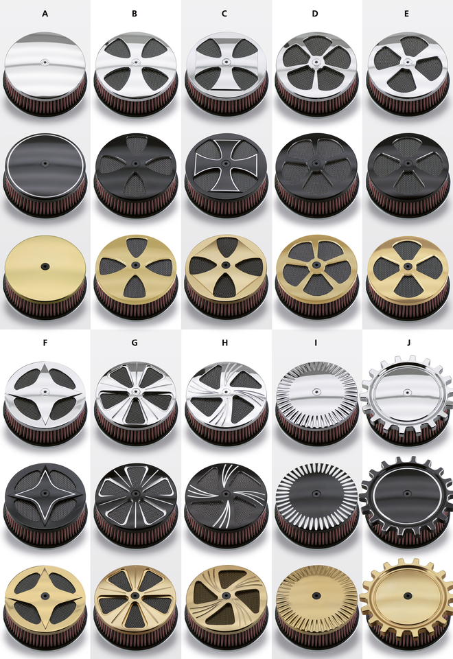 These 5 7/8" (15 cm) diameter custom and high performance air cleaners are machined from 6061-T6 billet aluminum. They are designed for high-end airflow with easy fitment and service. These HP Series air cleaners are available in classic chrome or black anodized with raw machined aluminum highlighted accents. Many great looking styles that compliment with any bike theme or style to choose from. The HP Series air cleaners include a backing plate with integrated high velocity stack for increased performance throughout the RPM range, a long-life low-resistance air cleaner element, mesh filter cover and a design style end cover. An adaptor kit to fit the HP Series air cleaner on your model and year motorcycle must be ordered separately.