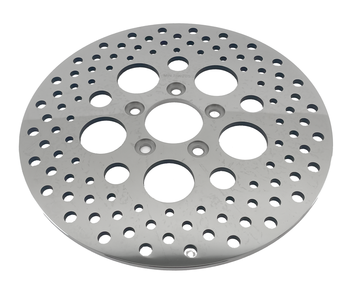 Made of chromium alloy Stainless Steel and precision ground for trueness, Surface induction hardened with a 12- 14% chrome contents for superior wear characteristics on full standard A1S1 #420 Stainless Steel plate. Rotors are compatible with all types of disc brake pads including sintered metal and are mirror polished. Drilled rotors provide better braking in wet weather, dissipate heat more efficiently, and reduce unsprung weight.