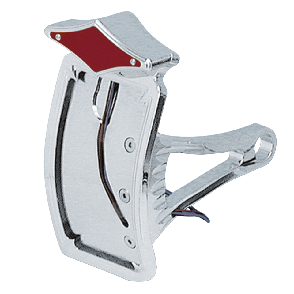 These "Design" LED taillight and license plate brackets are the ultimate in design and function. Both the side mount and rear mount take US size 10" x 7" (102mm x 178mm) license plates, are machined from Billet aluminum and then chrome plated for a perfect finish. Other features of LED lights are the use of less electrical power and live longer than common bulbs. The Diamond Style LED light that comes with these brackets is pre-wired for brake and taillight use and also has a provision for license plate lighting. Side mount license plate brackets bolt to the rear axle, and are available to take a horizontal or vertical license plate. The vertical brackets are available with normal flat license plate frame or in a curved version. Fender mount license plate bracket comes with your choice of hard rubber fender mount cushion, or solid block mount.