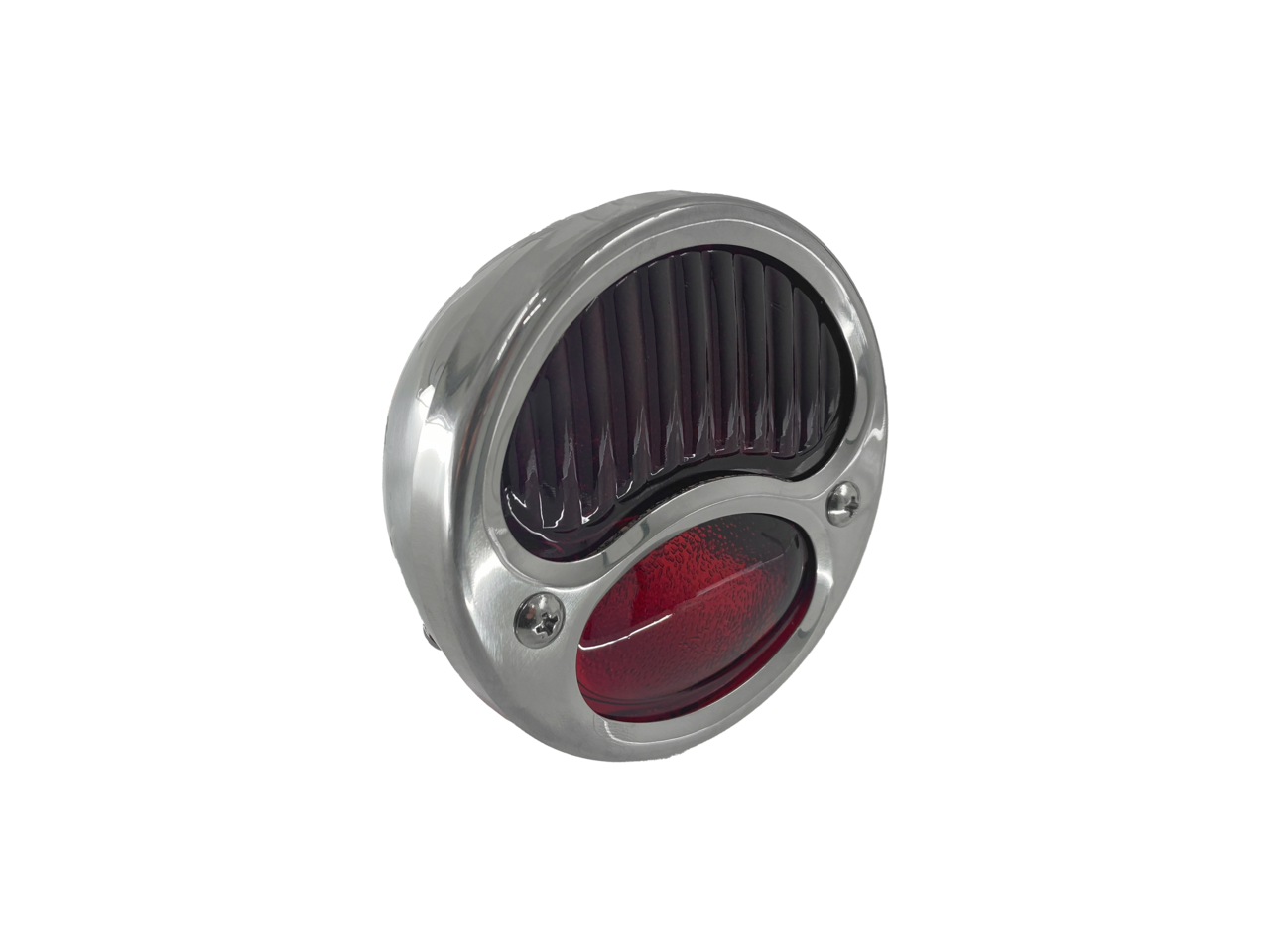 Classic style taillight with true Old School details like cork seals and real glass lenses. Light is 3 7/8" (9.8 cm) in diameter, has a 2 3/8" base with two-bolt construction and is 2 1/8" (5.4 cm) deep. Housing and trim ring are stainless steel. Features one bulb for taillight and license plate illumination, and another bulb for brake light. Comes pre-wired.