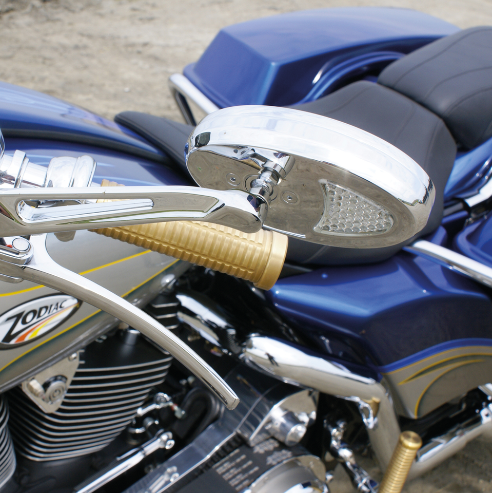 Chrome plated billet aluminum mirrors with beefy billet aluminum arms and built-in LED lights that can be used as running light/turn signal combination or turn signal only. Mirrors are pre-wired. The model with convex glass also has a red blinking arrow visible in the mirror glass. Sold in pairs.