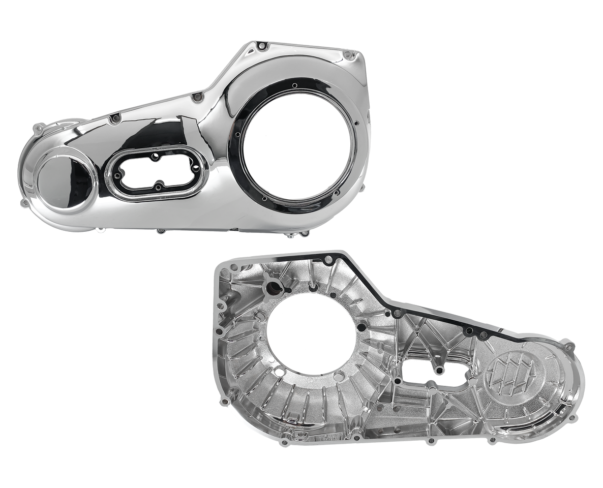These reinforced die-cast outer primary covers for Softail, FLH/FLT and Dyna models are another Zodiac exclusive. Covers have a show quality chrome plated finish. The 1995 thru 1998 cover for Softail & Dyna can be used on later models when you also install a 3-hole derby cover. The 1999-up cover for Softail & Dyna models can be used on earlier models when you also install a 5-hole derby cover.