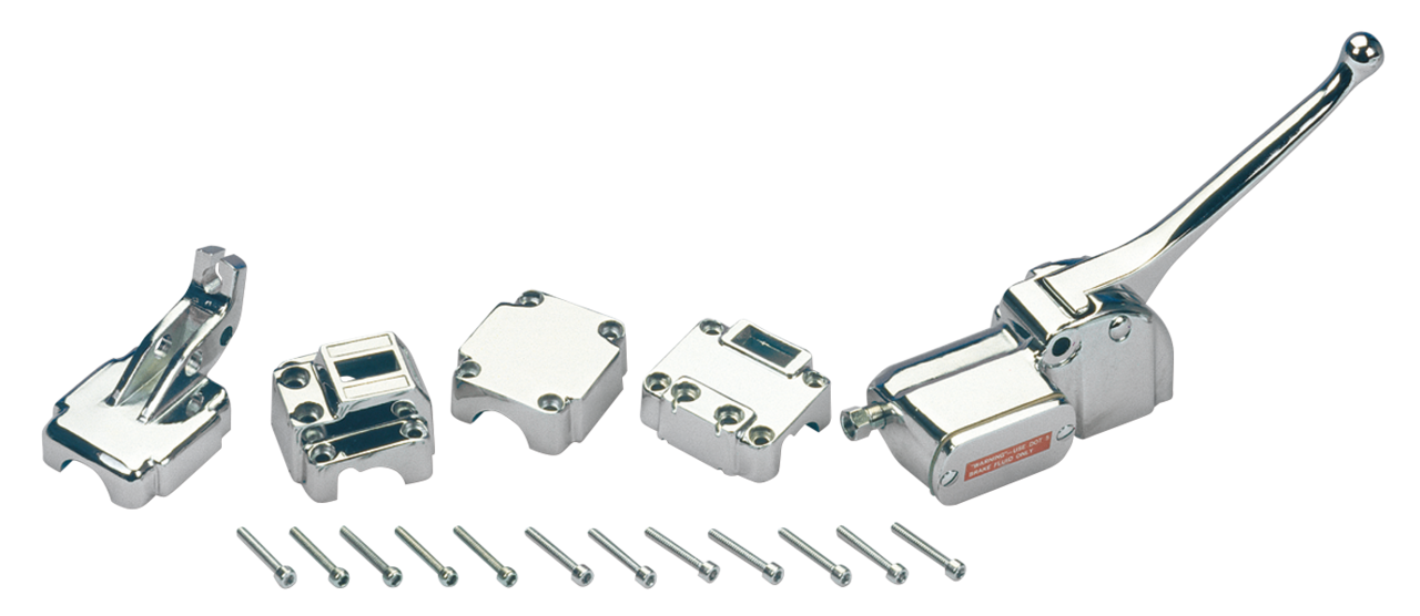 Fits 1973 thru 1981 FL & FLH, 1973 thru 1981 Sportster and 1973 thru 1981 FX, FXE, FXEF, FXB, FXS and FXWG. Can also be used on 1972 FL & FLH hand shift models when used with the OEM left switch housing back panel with integrated mirror bracket. Kits include 3/4" bore brake master cylinder for single and dual disc models, brake hose fitting, switch housings with screws, clutch lever with pivot pin and perch, decal kit and screws. Switches and related hardware are not included but available separately.