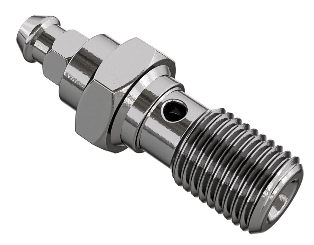 The ultimate solution for "Hard to bleed brake systems". These banjo bolts feature a bleeder nipple which allows you to bleed the air out of the brake system at the highest point or just before the brake fluid goes into the caliper. Makes bleeding your brake system easier and quicker. Bleeder banjo bolts are available in Stainless Steel or with chrome finish.