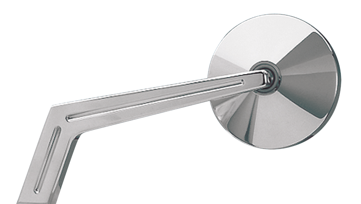 Features smooth round mirror head and angled ball milled arm. Mirror sizes: Head 3 1/16" (7.8cm), Arm 6 1/2" (16.5cm) long.