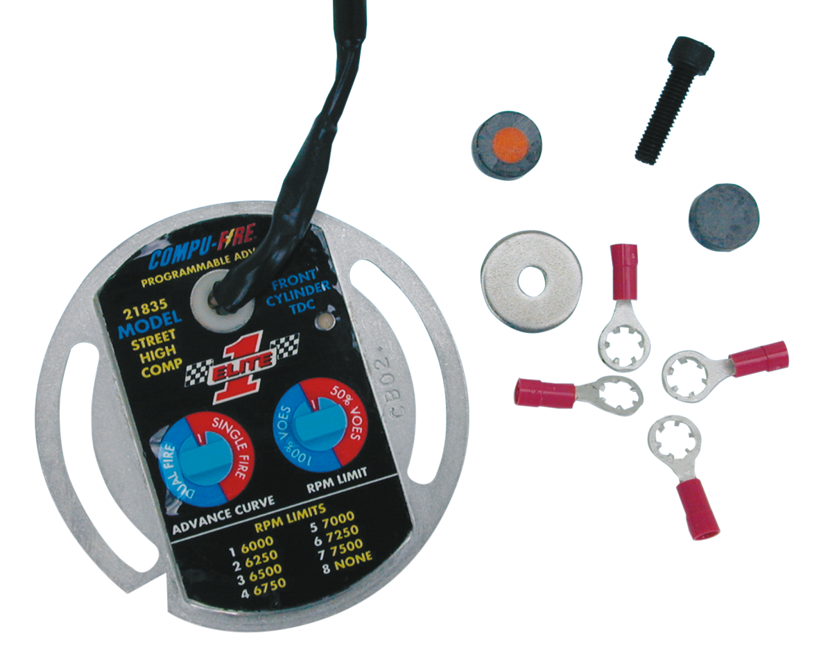 Compu-Fire claims that their selectable advance curve ignition modules are the most user friendly ignitions on the market. They feature a range of advance curves that meet the needs of engines from stock to wild. The large rotary switches allow advance curve and RPM limiter selection. Easy installation is made possible with a built-in LED static timing light. The modules feature extended temperature and low voltage operation with soft start circuitry for easy starting. The modules operate with Single Fire or Dual Fire coils with a primary resistance between 2.5 and 3 Ohm. The VOES is tuneable. Use with ZPN238038 Tach Adapter for Single Fire use in combination with an electronic tacho. Available in a version for stock to mildly tuned engines, as well as a version for engines with a seriously increased compression. The High Compression version is not recommended for kick start use. These Compu-Fire ignitions fit 1970-1999 Big Twin (except Twin Cam) and 1971-2003 Sportster.