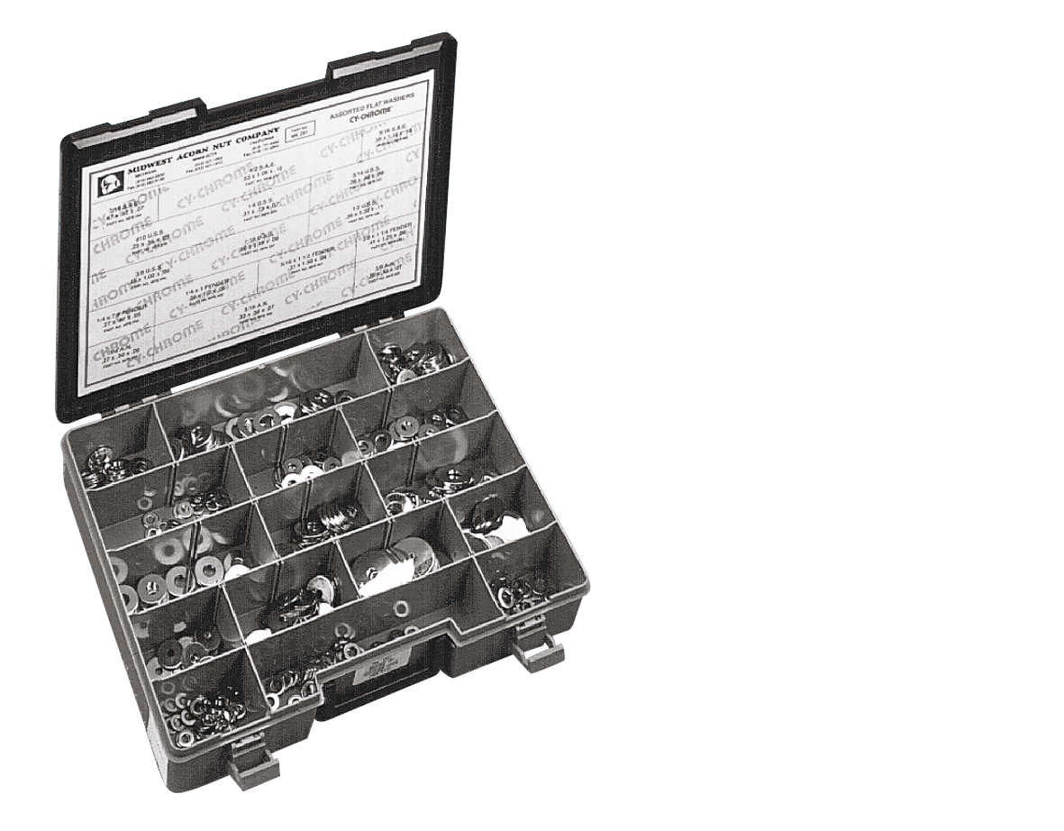 A complete assortment of Chrome plated flat washers. 16 Sizes in AN, Larger SAE, USS and Fender style, to cover all applications. Available in an assortment tray, containing 475 pieces in sizes as listed below. All sizes are separately available in pack quantities as listed below.