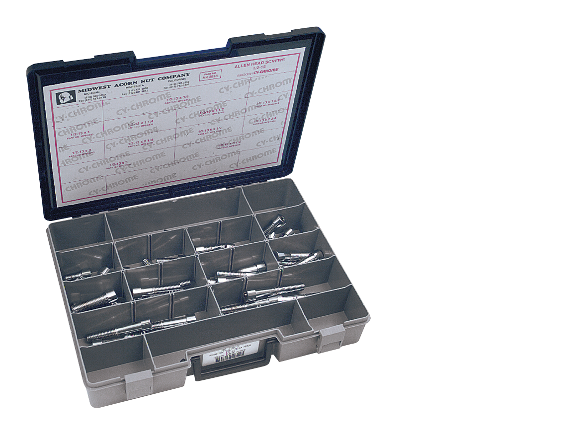 Complete assortment of 55 pieces 1/2" UNC grade 8 Allen head screws in 11 different sizes. Each size can be ordered in individual 5 packs.