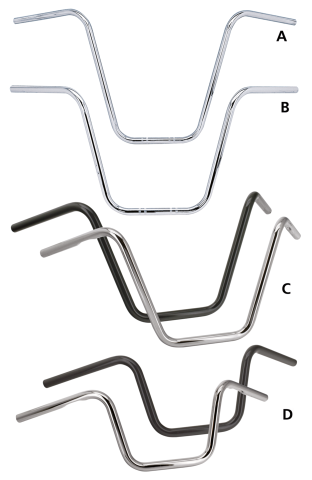 Top quality handlebars are precision made in Holland from 1" (25.4mm) heavy gauge steel tubing. Dimpled bars have indents to give space to route the handlebar switch control wires on Harley-Davidsons. Non-dimpled bars do not have this feature. All Zodiac Custom Products handlebars are designed for regular cable throttle but can easily be modified to accept Throttle-By-Wire.