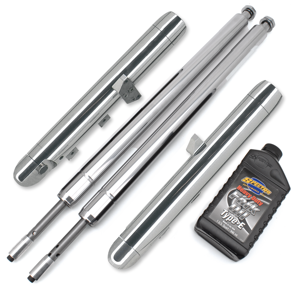 Ton has put the Fat Bubba on a diet! The result, the Naked Bubba. Like the original Fat Bubba's they feature massive Triple Tree clamps, large diameter bottom sliders and Hidden Axle mount. Triple tree and sliders are machined from billet aluminum and have a mirror shine polished or polished black finish. The upper triple tree clamp is 1 1/8" (29mm) thick, the lower triple tree clamp measures 1 5/16" (34mm). The fork sliders have a very impressive diameter of 2 3/8" (60mm) and feature fender brackets, as well as dual caliper mount. Fork sliders are topped off with billet aluminum dust covers. Conversion brackets that take 1984 thru 1999 style or 2000 to present style OEM or aftermarket brake calipers are available but must be ordered separately. Other conversion brackets must be custom made. The front wheel axle has a hidden mount for extra sleek looks. Forks are available in +2", +3", +4", +6", + 8", +12", +14" and +16" over stock FL length (actual fork leg length is also listed) and with 0, 3, and 6 degrees raked triple tree. These Fat Bubba forks come complete with 3 different fork stops to work with almost any stock or aftermarket frame. A bottle of fork oil is included with each set.