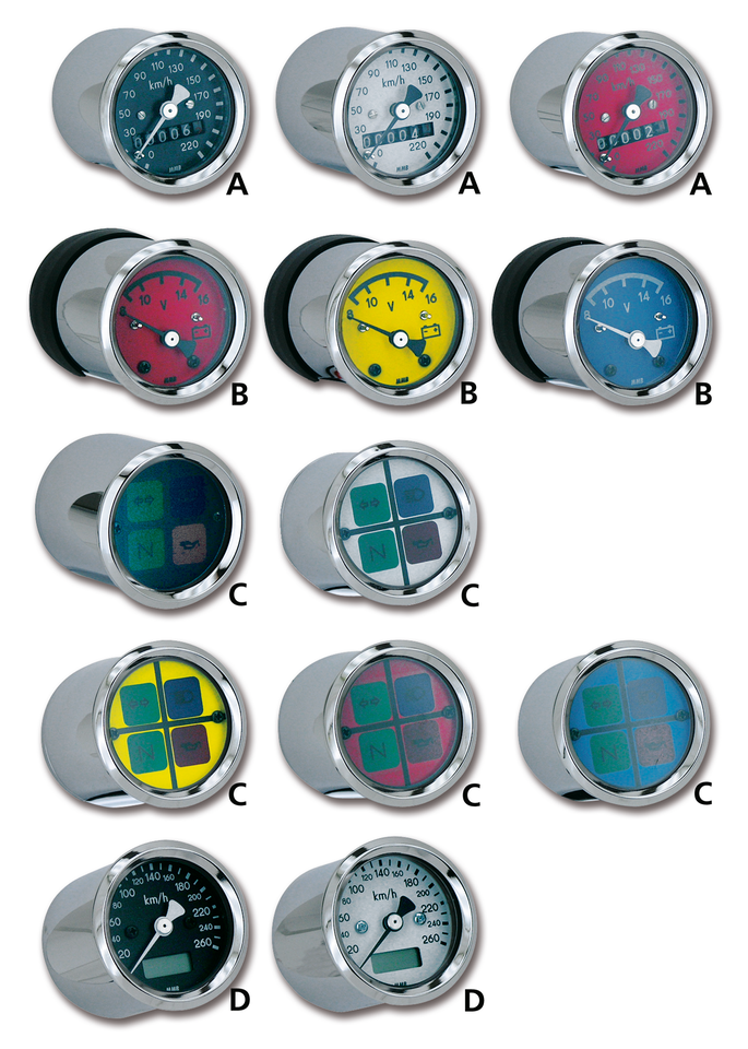 These mini gauges have a diameter as little as 48mm with a top ring of 52mm. The housing has a length of 47mm. These meters feature all chrome housing and dial illumination. Electronic speedos work with the separately available pick up sensors or the stock Harley speed sensor on 1995-2010 Softail, 1995-2011 Dyna, 1995-2013 Sportster, 1995-2013 Touring and 2002-2017 V-Rod. Not suitable for later models with the CAN-Bus (HD-Link) system. Mounting bracket must be ordered seperately.