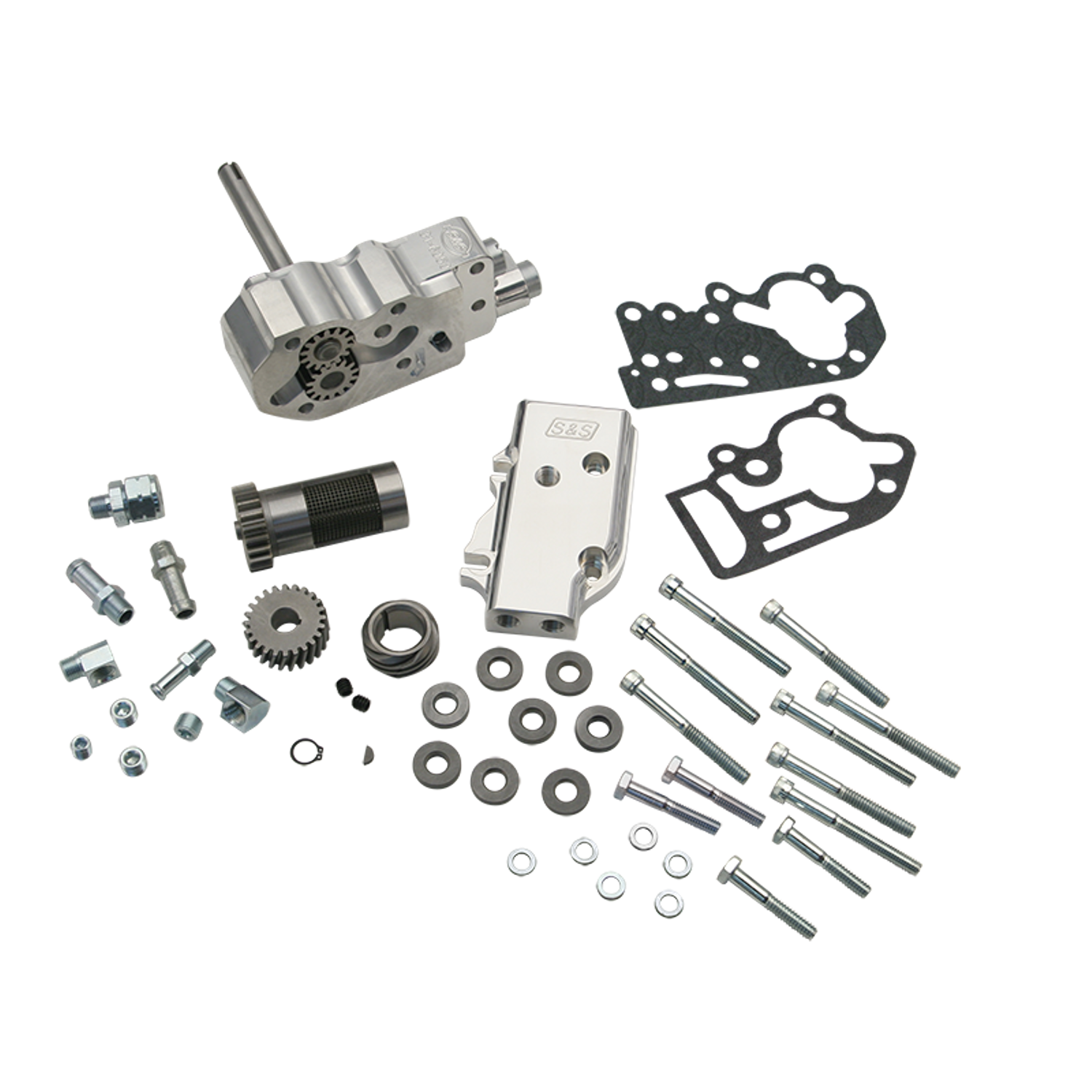 S&S's new, 1981 thru 1999 style oil pumps for Big Twin are CNC machined from solid billet aluminum for strict manufacturing tolerances and high-gloss polished for that "different look". S&S oil pumps route surplus oil back to the main supply passage rather than the return to eliminate unnecessary filtering and offer the opportunity to upgrade earlier engines to the 1981-up oiling system. This oiling system splits bottom and top end oil supplies, increasing oil pressure to hydraulic lifters and top end. Another simple, optional modification will improve primary chain oiling in 1965 thru 1972 models. The oil pump cover is compatible with both OEM steel oil lines as well as conventional neoprene line to insure a simple installation and professional, uncluttered appearance. S&S oil pump assemblies come complete with all internal parts assembled, gaskets, drive shaft with keys and snap ring, mounting hardware, check ball and pressure relief valve assemblies. For those who want everything to be 101% there is an oil pump assembly complete with drive gear, breather gear and shim kit available.