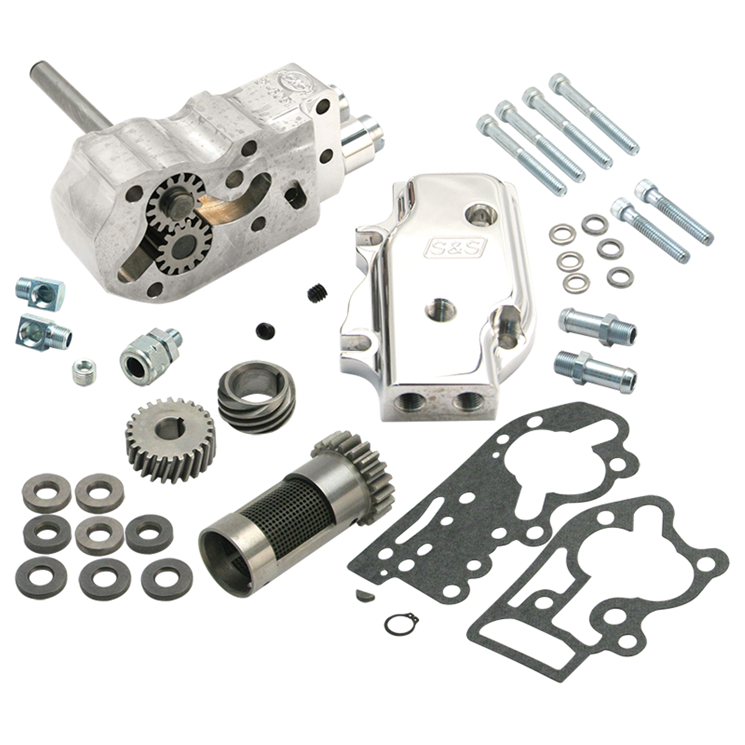 S&S's new, 1981 thru 1999 style oil pumps for Big Twin are CNC machined from solid billet aluminum for strict manufacturing tolerances and high-gloss polished for that "different look". S&S oil pumps route surplus oil back to the main supply passage rather than the return to eliminate unnecessary filtering and offer the opportunity to upgrade earlier engines to the 1981-up oiling system. This oiling system splits bottom and top end oil supplies, increasing oil pressure to hydraulic lifters and top end. Another simple, optional modification will improve primary chain oiling in 1965 thru 1972 models. The oil pump cover is compatible with both OEM steel oil lines as well as conventional neoprene line to insure a simple installation and professional, uncluttered appearance. S&S oil pump assemblies come complete with all internal parts assembled, gaskets, drive shaft with keys and snap ring, mounting hardware, check ball and pressure relief valve assemblies. For those who want everything to be 101% there is an oil pump assembly complete with drive gear, breather gear and shim kit available.