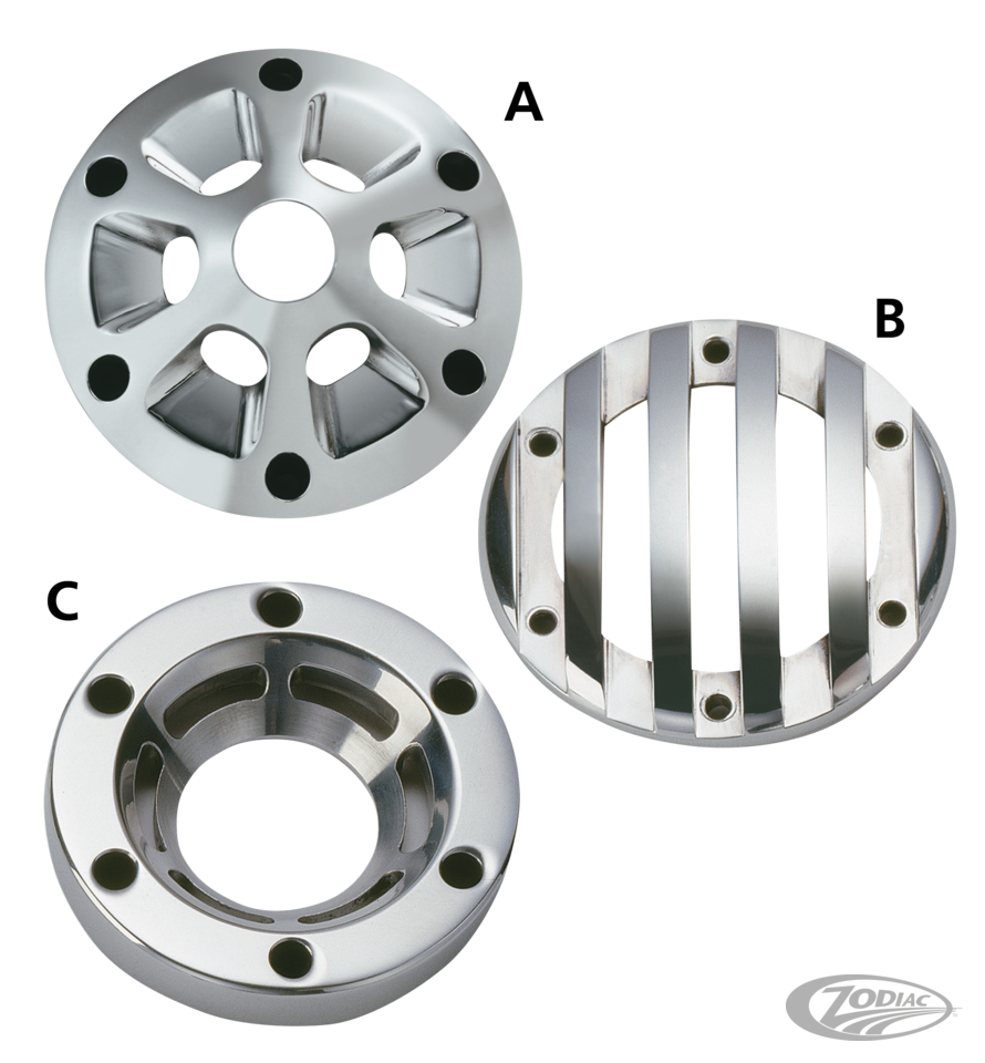 SuperTrapp designed 5 great styled end caps for the 4" external disc mufflers. These end caps give you the opportunity to personalize the appearance of exhaust systems. Made from heavy metal with a perfect finish. Available in your choice of "Star", "Grate", "Cone", "Dotted wheel" or "Slotted Wheel" style. Caps are sold each.