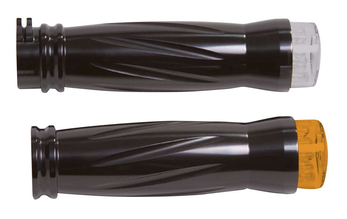 Manufactured by RBS from billet aluminum. These stylish handlebar grips feature state of the art bright shining "Built-In" turn signals with LED lights. Fits all models 1973 to present except those with handlebar air reservoirs. They come in four different styles and are available in polished aluminum, chrome plated or black coated.