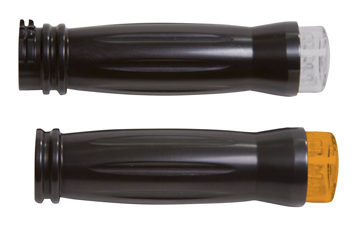 Manufactured by RBS from billet aluminum. These stylish handlebar grips feature state of the art bright shining "Built-In" turn signals with LED lights. Fits all models 1973 to present except those with handlebar air reservoirs. They come in four different styles and are available in polished aluminum, chrome plated or black coated.