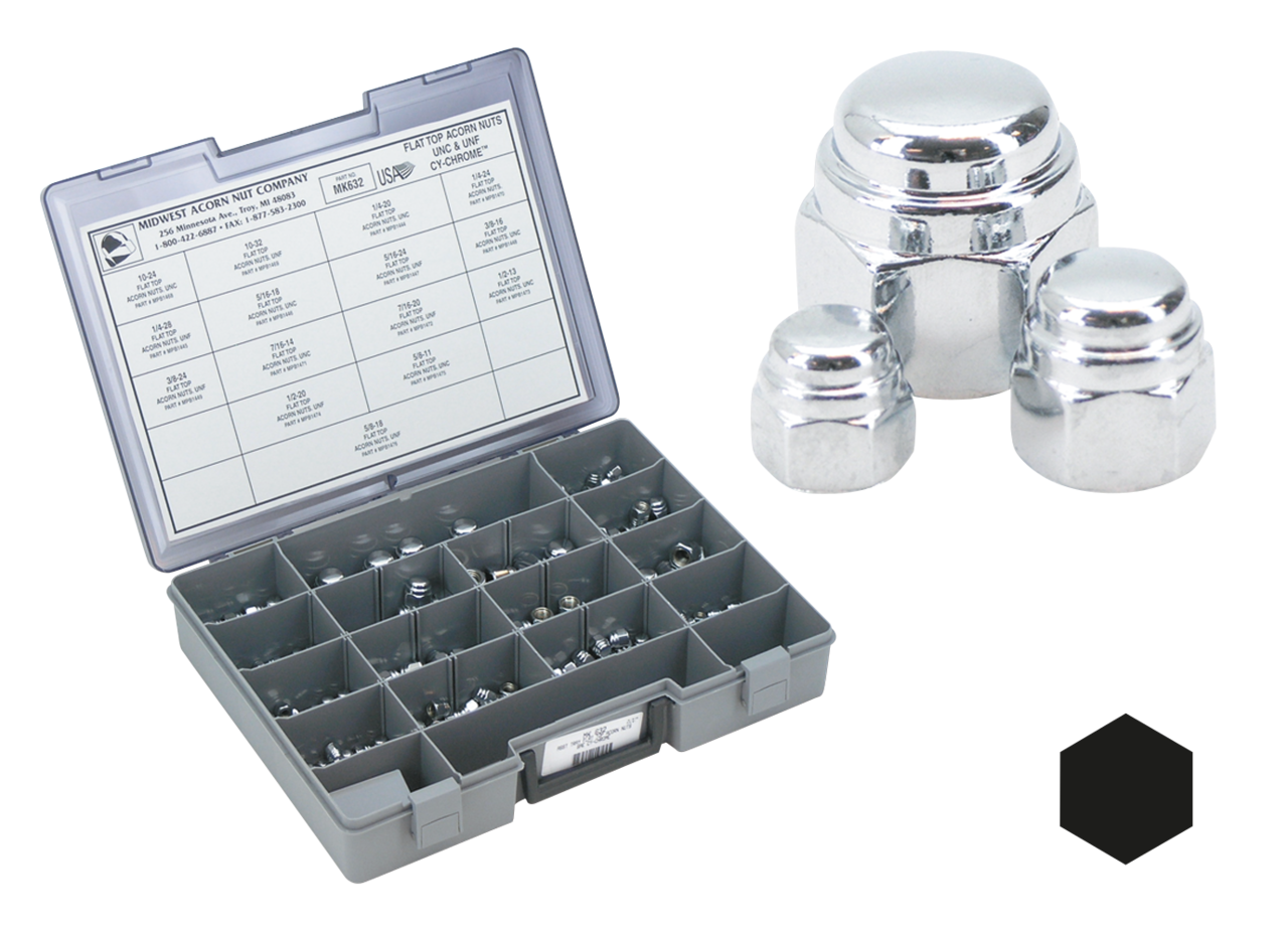 Complete assortment of 120 pieces chrome Flat Top Acorn nuts of sizes as listed below. All sizes are also available individually in dealer 5- or 10 packs.