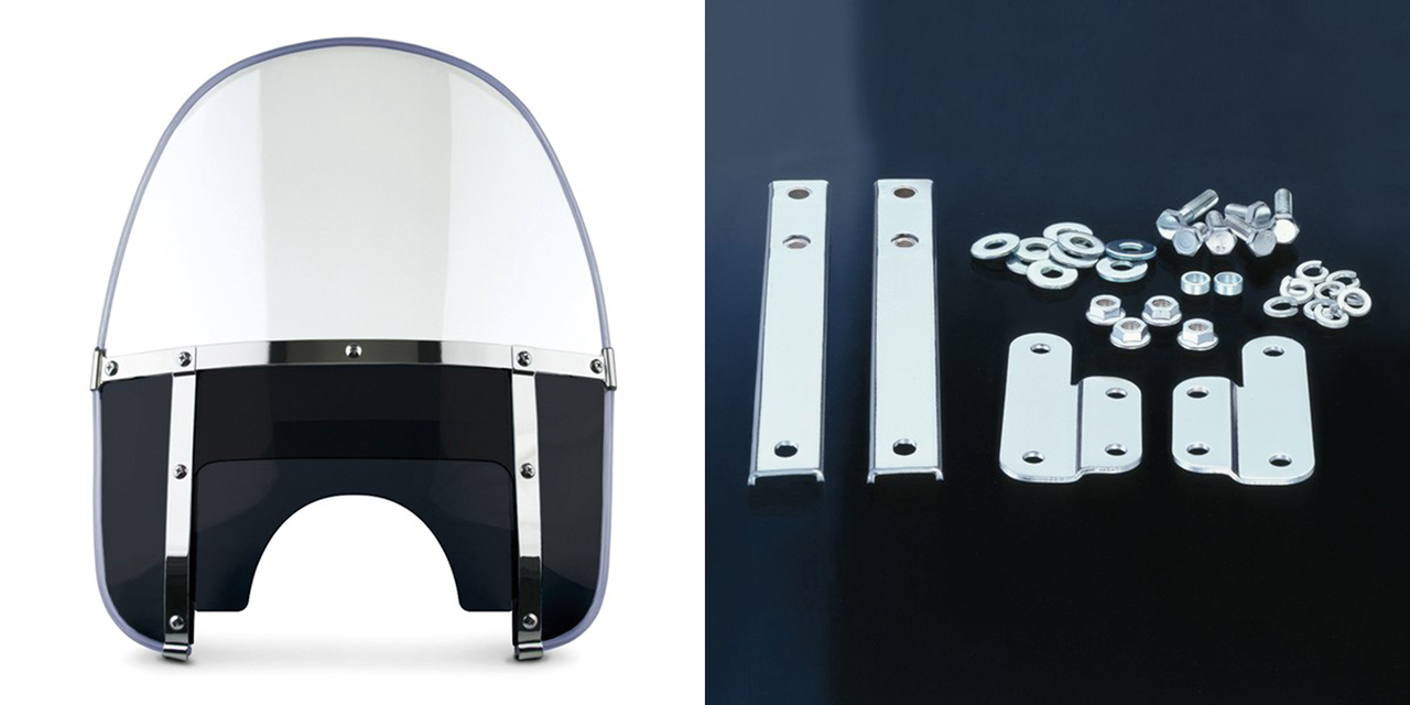 The Beaded Heavy Duty is an authentic three-piece beaded construction. The beaded edge that has been applied in a modern way without glue to reduce yellowing and remain good looking for many years. The Beaded Heavy Duty uses FMR hardcoated Lexan polycarbonate and is 21 1/4" (54cm) high and 22 1/2" (57cm) wide. Windshields feature highly polished chrome steel outer hardware with non-glare black epoxy coated steel inner straps. Complete windshield kits come with the required mounting hardware. Standard round top windshields have an adjusting window with a round cutout. The 1960-1984 style windshields have, as standard in these years, a notched adjusting window. The 1949-1959 style windshields have a peaked top and cupped adjusting window. When you also want to create some convenient up-front storage we have a Holdster windshield bag available as an accessory.