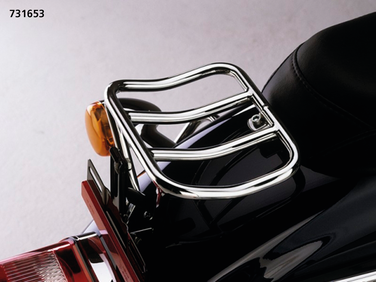 Rack mounts easily under the passenger seat mount bolt and the license plate bracket mount bolts. The rack is just large enough to take some luggage and just small enough to not disturb the sporty lines of your Sportster.