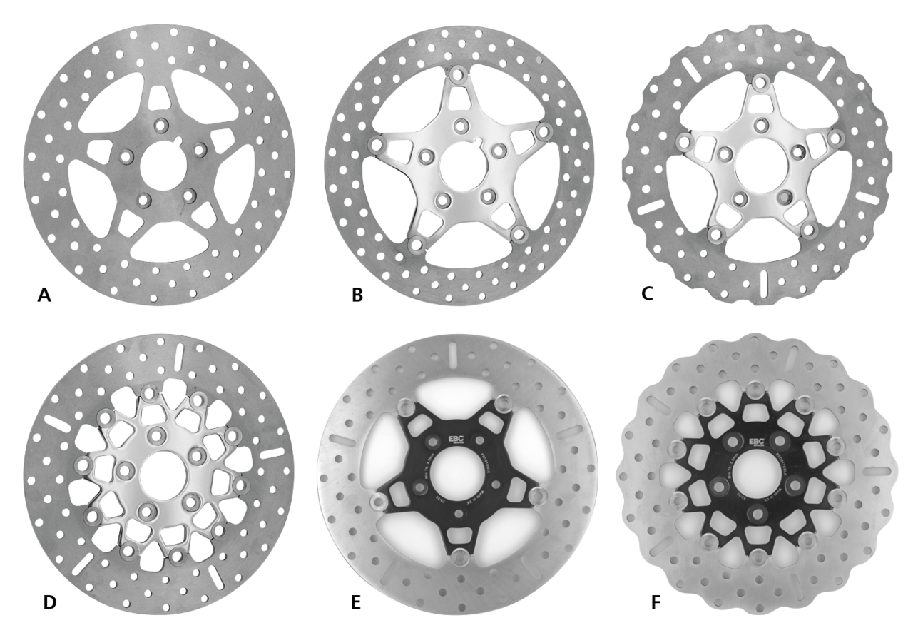 EBC produces a complete range of floating and non-floating disc brake rotors for modern Big Twin and Sportsters. EBC rotors are made in the UK using stainless steel for the brake rotor itself and polished or black stainless steel center hubs. EBC has opted for stainless steel center hubs due to the weight and heavy duty nature of larger American motorcycles. Floating rotors are assembled using the unique EBC SD System square drive button technology. EBC front floating rotors feature 5 buttons whereas rear rotors include 10 drive buttons to provide a sturdy looking and robust unit worthy of its heavy duty application. EBC strongly recommends to always use new pads when replacing rotors as the use of old or worn pads can cause hot spots or glazing of the rotor and will promote brake fade and loss of brake. EBC brake pads can be found elsewhere in this catalog. EBC offers a range of 5 spoke solid brake rotors and a choice of 5 spoke floating rotors in full circle rotor design or contoured profile rotor design. Discs are available in "Wide Band" for use with stock or stock style calipers or "Narrow Band" for use with aftermarket calipers.
