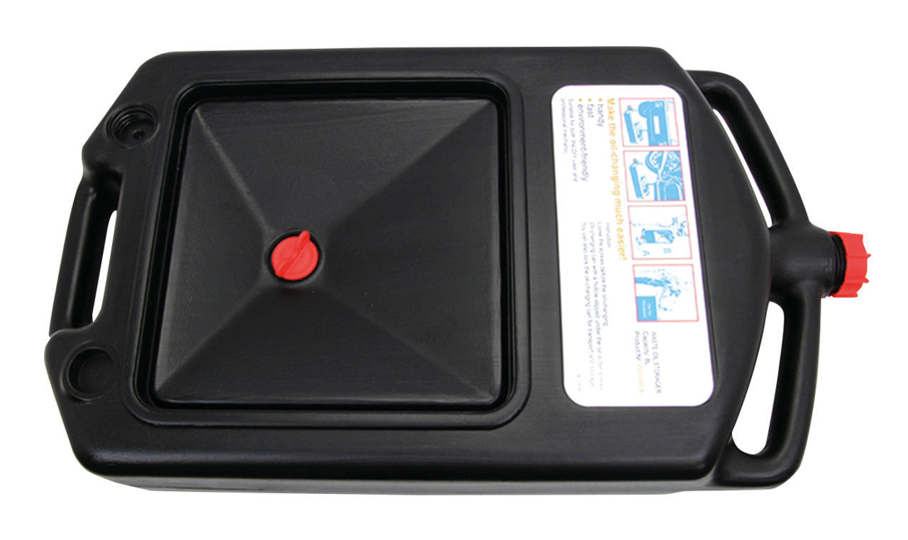 Plastic jerry can with build-in drain pan is indispensable for a clean oil change. Holds 2.5 US Gallons (almost 9.5 liter) of waste oil. Measures 21"x12"x4 3/8" (53x30x11cm).