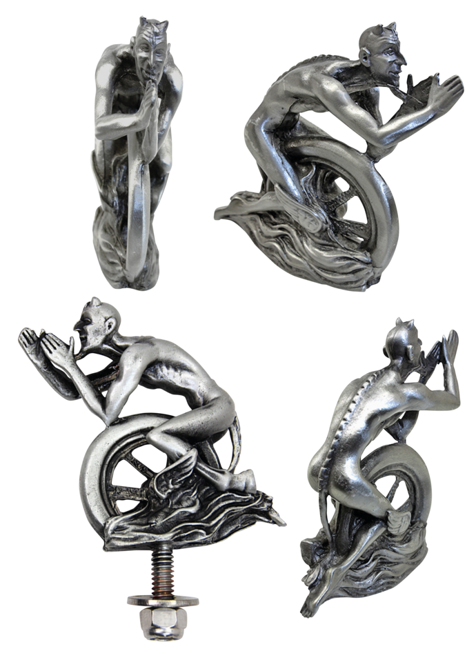 Devil and wheel fender ornament is pewter type metal with a silver finish and is to be mounted with the included 1/4"-20 threaded stud. Height 2 3/4" (7cm), length: 2 1/8" (5.4cm), width 3/4" (1.9cm).
