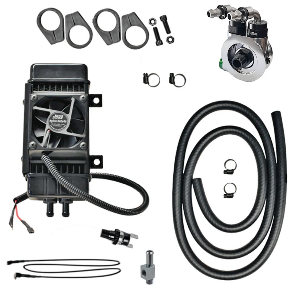 Extreme performance in a compact package, the Jagg Fan-assisted Vertical Oil Cooler system is designed to perform as well at low vehicle speeds and in stop-and-go traffic as on the open highway. The 10-row high-performing two-pass Jagg oil cooler is engineered to fit all bikes with vertical frame tubes. Specifically designed to exceed the cooling demands of the modern V-Twin motorcycle. Smooth end caps and a gloss-black finish help this cooler blend in with the frame and hardware for a clean, streamlined look. The cooler mounts to the left frame down-tube, spaced away from the frame to allow airflow to both the oil cooler and the engine's cylinders. The cooler is mounted to the frame using unique, highly-durable, Uralite mounts, which have a shock absorbing effect and clean styling. The 10-tube, two-pass design offers significantly more cooling surface than its closest competitor. Special in-line turbulators add to the cooler's efficiency with minimal oil pressure loss or restriction. Aluminum construction with durable powder coated finish. The Jagg WeatherTek, a worldwide exclusive dust-tight and waterproof fan, turns on automatically at circa 100°C (210°F) and pulls a full 75cfm across the cooler. The included Jagg's unique thermostatically-controlled offset oil filter adapter provides an easy access point to the bike's oil supply for the installation of the oil cooler. The sandwich-style adapter is machined from two pieces of billet aluminum and then hard-anodized to a satin black finish. The adapter installs between the bike's stock oil filter mount and the oil filter, and is designed with the same Hyper Flow Technology as all Jagg components to ensure great performance as well as great flow characteristics. The Fan-assisted Vertical Oil Cooler System is supplied complete with all necessary hardware and detailed, easy-to-follow installation instructions.