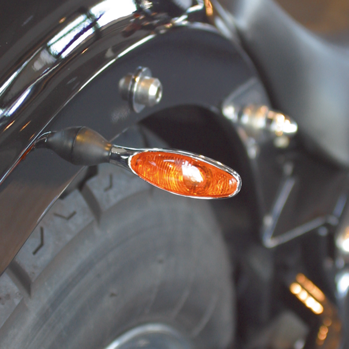 Great looking, but in fact the smallest turn signals on the market today. They measure only 2 5/8" long, including the stem, and are only 5/8" high. Come with EU approved lenses and are approved for use as rear turn signal. Available in your choice of chrome plated, satin or black epoxy coated with 21 Watt Halogen bulb or state of the art LED lighting. There is even a "Stealth" version with a black housing and ultra dark lens, dark as the night but super bright when working. Installation of LED type turn signals requires -except for models with a CAN-Bus system-, the use of an electronic turn signal flasher unit such as the ZPN237304 or two Kellermann in-line resistors ZPN742046 to retain the original flashing sequence. Resistors as well as turn signals are sold each.