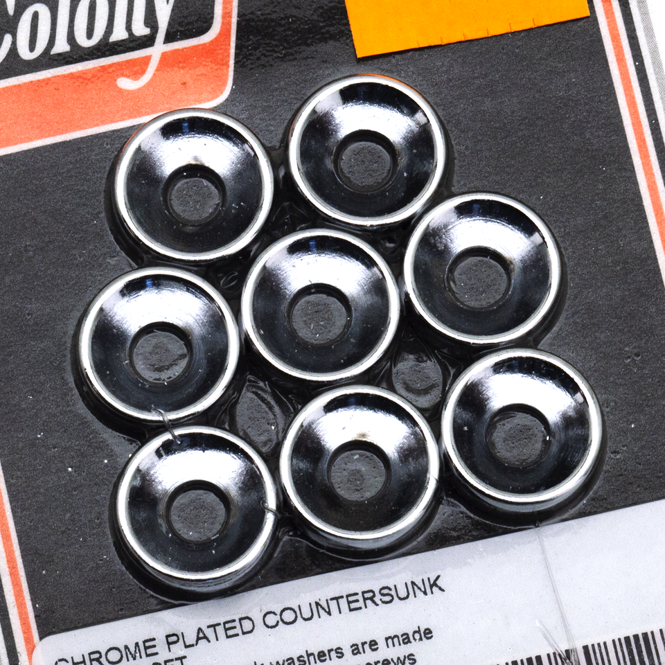 These chrome plated 82 degrees countersunk washers are made to accept flat head Allen screws for a variety of Custom applications. Available in sizes from #10 thru to 7/16" in various pack quantities.