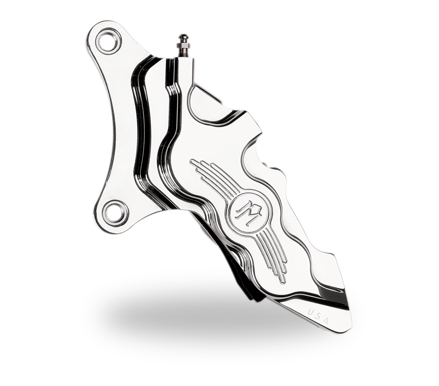 These "112x6B" type compact 6 piston differential bore calipers are designed for use with stock or aftermarket 11 1/2" disc rotors, but also available for use with 13" aftermarket discs. This direct bolt on caliper has its design roots in endurance road racing which showed the need for differential bore sizes use a larger trailing piston to compensate for uneven pad wear under high heat applications. PM has introduced this technology in these 6 piston calipers. The differential bore system has been race proven and is ready to give you the best feel possible and smooth powerful braking. Single or dual, this is the very best front brake set up anywhere. These calipers bolt straight onto the stock lugs on the front fork. Order 1 left caliper for single disc and 1 right and 1 left for dual disc application. Sportster 2008-2013 models require a brake master cylinder with 9/16" bore for single disc or 11/16" bore for dual disc.