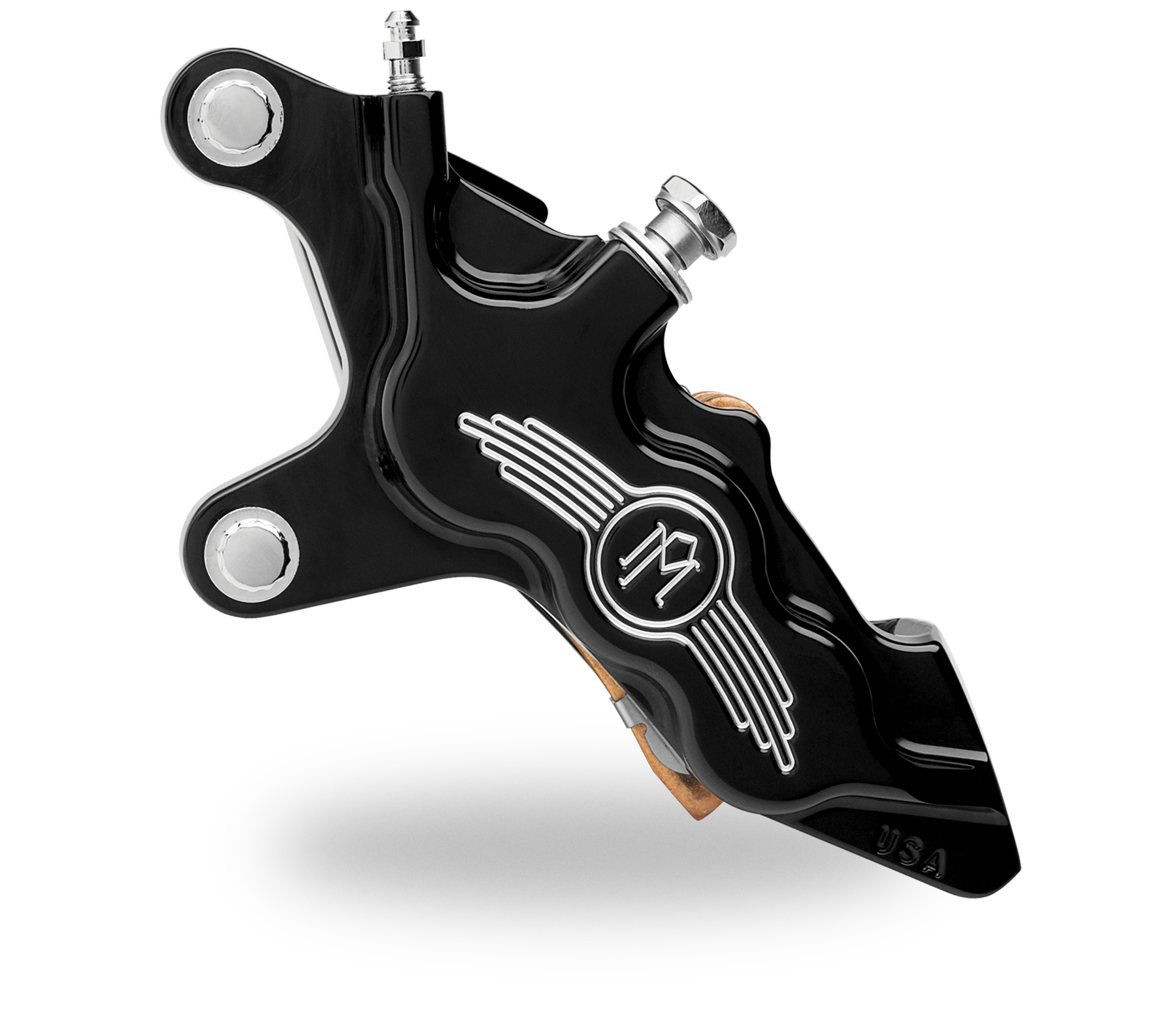 These "112x6B" type compact 6 piston differential bore calipers are designed for use with stock or aftermarket 11 1/2" disc rotors, but also available for use with 13" aftermarket discs. This direct bolt on caliper has its design roots in endurance road racing which showed the need for differential bore sizes use a larger trailing piston to compensate for uneven pad wear under high heat applications. PM has introduced this technology in these 6 piston calipers. The differential bore system has been race proven and is ready to give you the best feel possible and smooth powerful braking. Single or dual, this is the very best front brake set up anywhere. These calipers bolt straight onto the stock lugs on the front fork. Order 1 left caliper for single disc and 1 right and 1 left for dual disc application. Sportster 2008-2013 models require a brake master cylinder with 9/16" bore for single disc or 11/16" bore for dual disc.