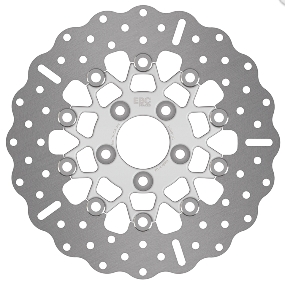 EBC produces a complete range of floating and non-floating disc brake rotors for modern Big Twin and Sportsters. EBC rotors are made in the UK using stainless steel for the brake rotor itself and polished or black stainless steel center hubs. EBC has opted for stainless steel center hubs due to the weight and heavy duty nature of larger American motorcycles. Floating rotors are assembled using the unique EBC SD System square drive button technology. EBC front floating rotors feature 5 buttons whereas rear rotors include 10 drive buttons to provide a sturdy looking and robust unit worthy of its heavy duty application. EBC strongly recommends to always use new pads when replacing rotors as the use of old or worn pads can cause hot spots or glazing of the rotor and will promote brake fade and loss of brake. EBC brake pads can be found elsewhere in this catalog. EBC offers a range of 5 spoke solid brake rotors and a choice of 5 spoke floating rotors in full circle rotor design or contoured profile rotor design. Discs are available in "Wide Band" for use with stock or stock style calipers or "Narrow Band" for use with aftermarket calipers.