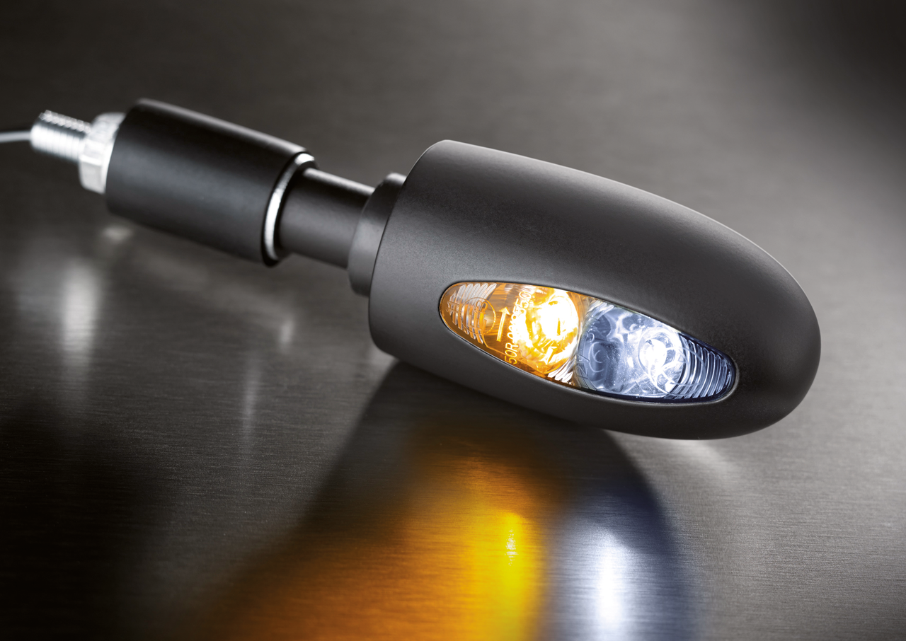Combines a high brightness integrated position light and indicator. Feature special control technology and modern high-performance-LEDs for improved visibility and speed recognition. The increased power and crystal clear double look gives the impression of daylight-bright lights and meanwhile also dampens handlebar vibrations. Sold each.