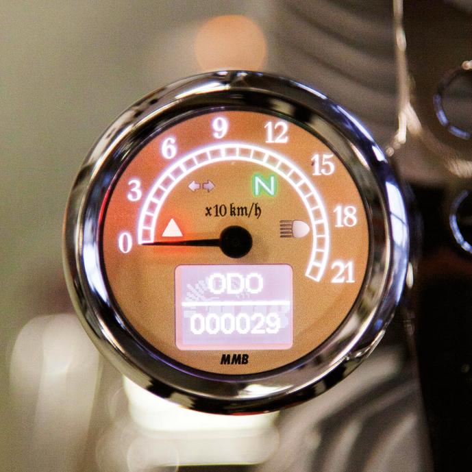 The Retro series are a tribute to the beginning of motorized transportation. They are a compact design with a depth of only 46mm and a bore of 48mm. Available with 220 km/h and 120 mph scales that feature a digital trip and total odometer. Speedo works with the seperately available Hall-effect sensor, as well as with the stock Harley speed sensor on 1995-2010 Softail, 1995-2011 Dyna, 1995-2013 Sportster, 1995-2013 Touring and 2002-2017 V-Rod. Not suitable for later models with the CAN-Bus (HD-Link) system.