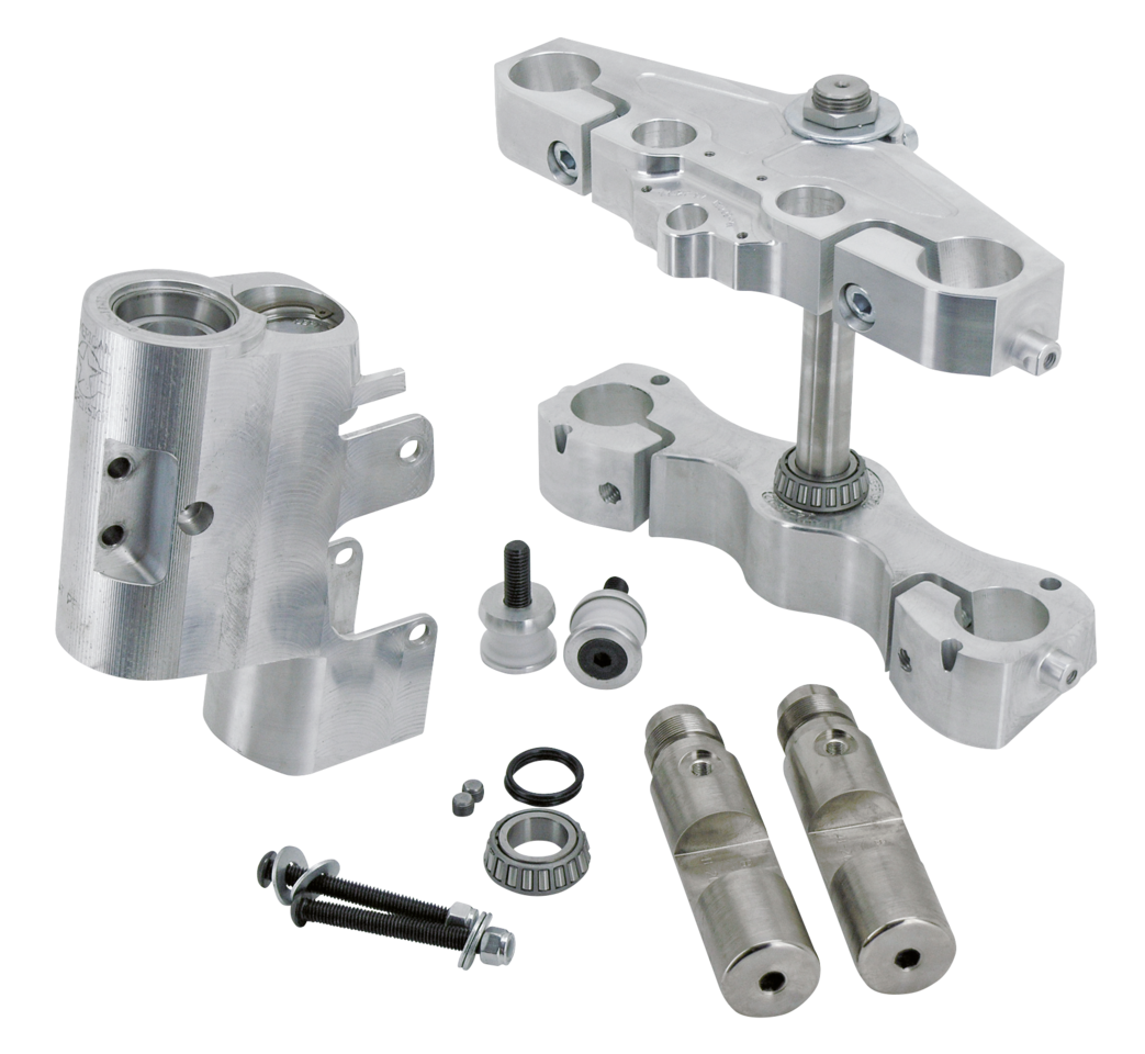 The American Suspension bolt-on Neck Kit is designed for quick and easy installation with a focus on strength and stability and features several redundant mounts for maximum reliability. Can also be easily removed when you want to turn back to your stock size front wheel. The patent pending kit includes: billet aluminum neck, steering stem, billet aluminum triple trees, bushings, fork caps, and bearings. The American Suspension Bolt on Neck Kit for Touring changes rake and trail, offering the correct geometry and great handling in conjunction with 26" or 30" front wheels. Installation on FLTR Road Glide models require the separate purchase of a fairing mounting bracket kit.