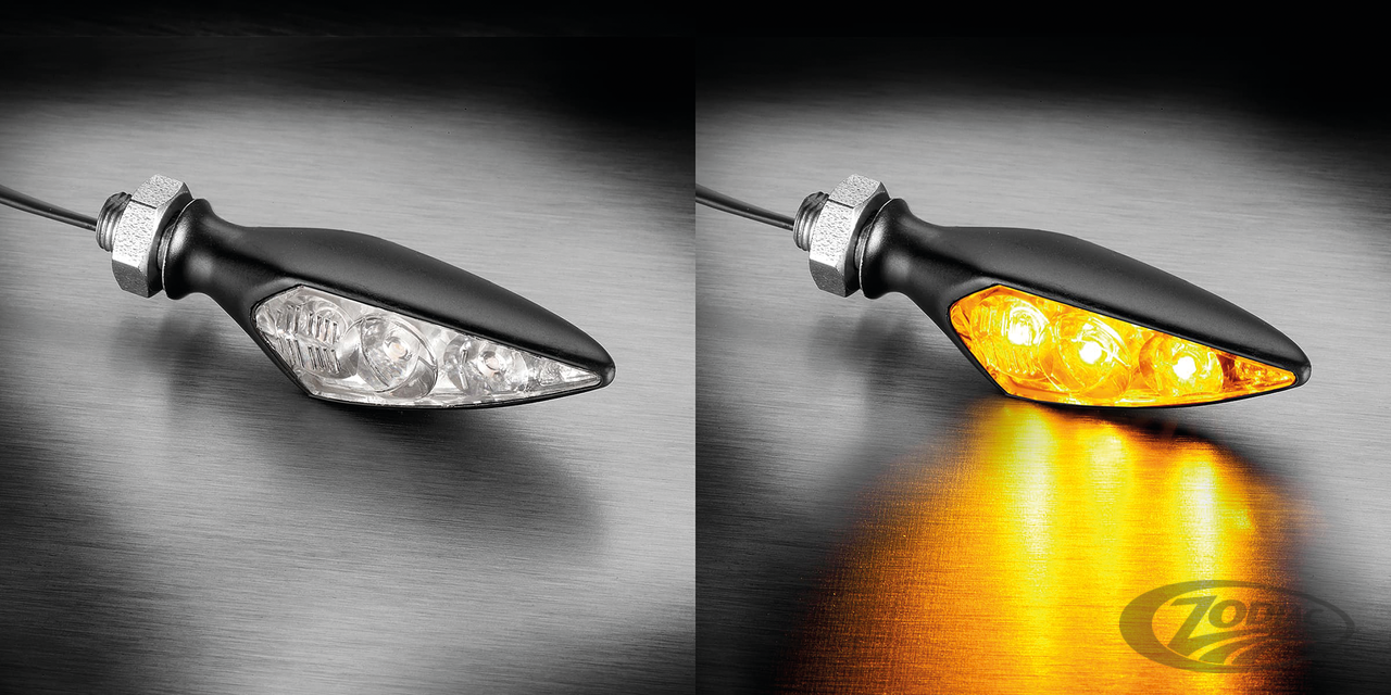 Rhombus turn signals are waterproof and feature LED lighting and a "Longlife-Protection-Guard-Electronics" circuit. Rhombus lights are EU approved for use on motorcycles for front and rear use. Rhombus Extreme lights are EU approved for use on quads, cars and trailers, as well as for motorcycles, even fitted in a distance of only 2cm from the head light! There is even a "Stealth" version with a black housing and the lens dark as the night but super bright when working. Installation of LED type turn signals requires -except for models with a CAN-Bus system-, the use of an electronic turn signal flasher unit such as the ZPN 237304 or two Kellermann in-line resistors ZPN 742046 to retain the original flashing sequence. Resistors as well as turn signals are sold each.