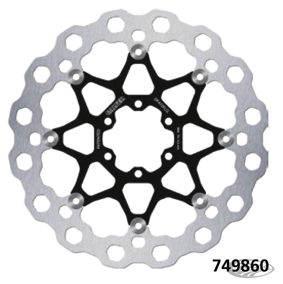 Galfer brake discs for use with stock and stock-replacement calipers. Full floating discs have stainless steel outer bands with black coated steel centers, held by and clear stainless floating elements. As with every brake disc it is strongly recommended to install new brake pads with a new brake disc.