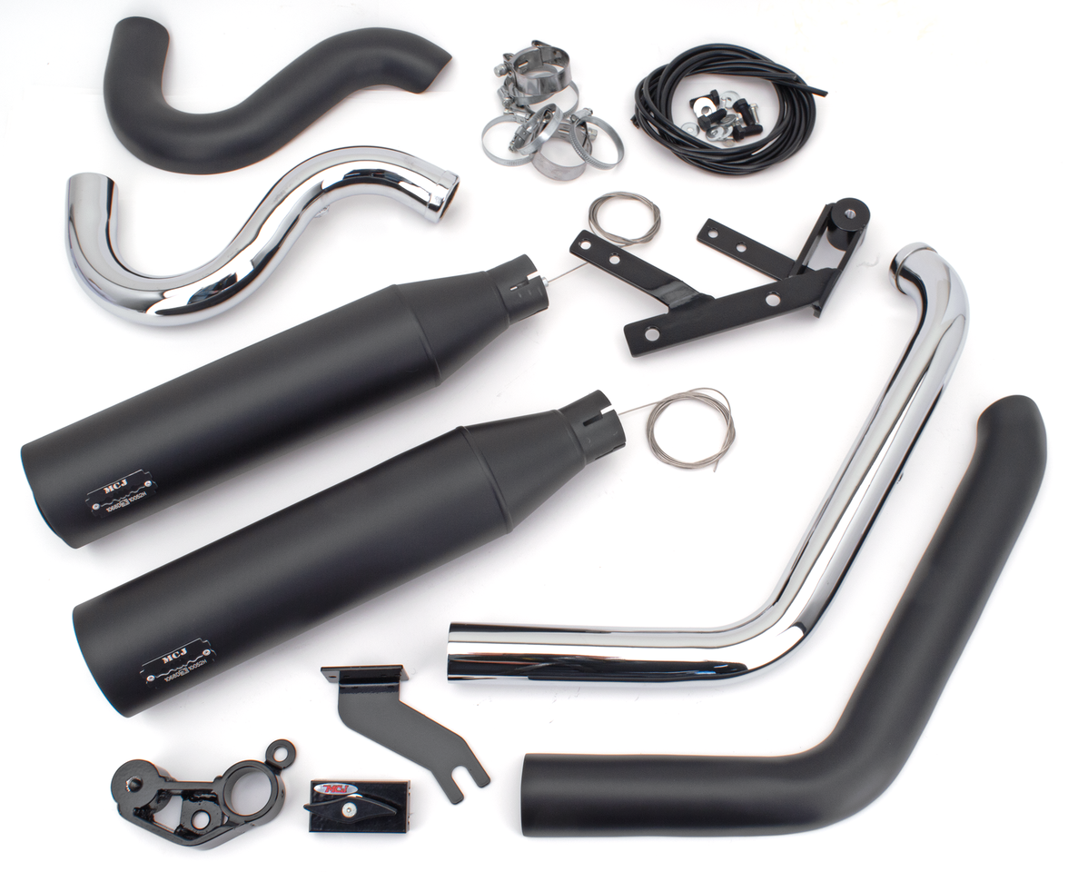 E-approved 2-into-2 systems with headers, heat shields and mufflers. Exhausts feature an adjustable exhaust valve that allows you to tune the sound of your bike the way you like it, but still get back to what is legal. These exhausts come complete with a manual operated adjusting lever that can be placed on either the handlebar or below the tank. Electric operated adjusting motors are available as an option. "Royal Style 90" end caps must be ordered separately.
