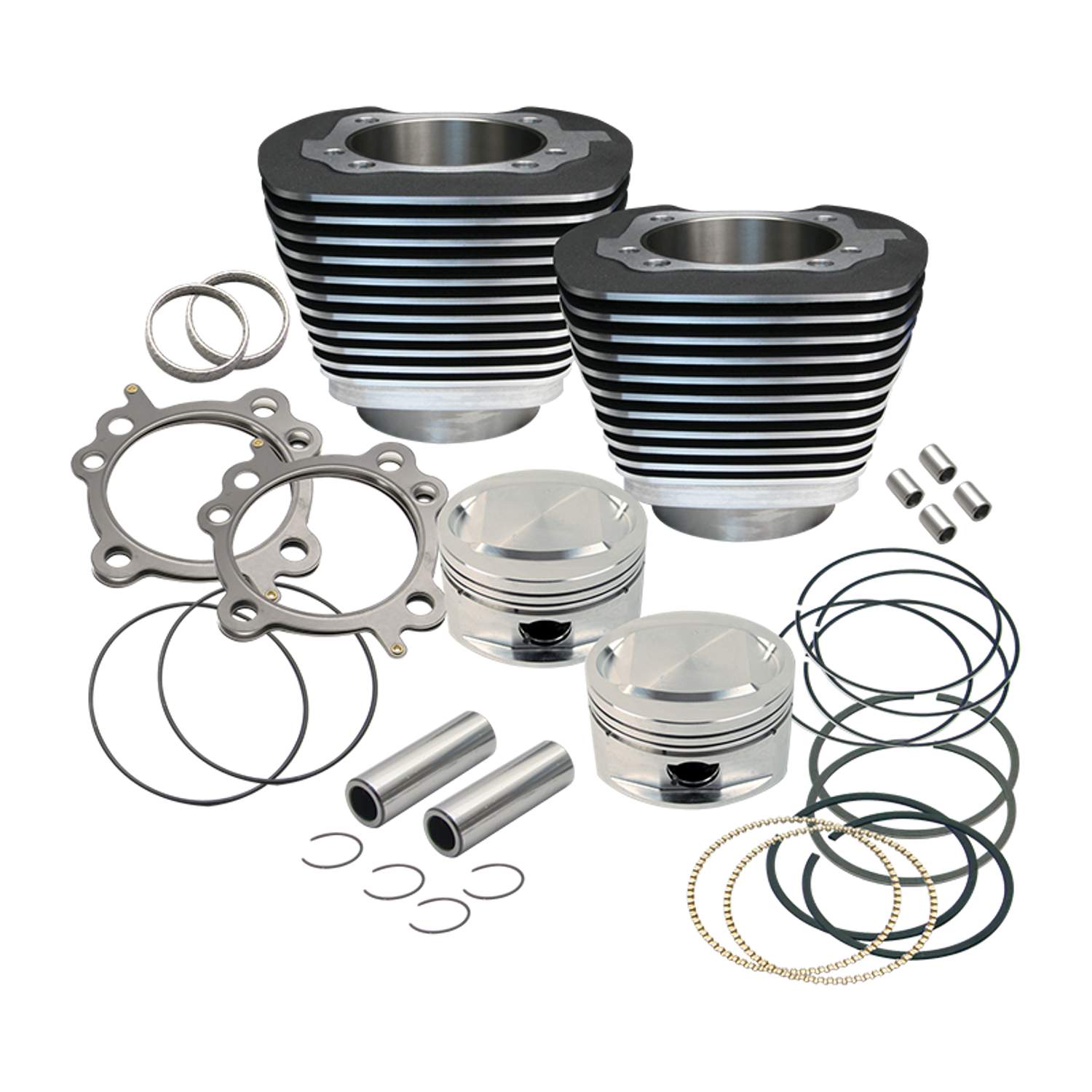 These Big Bore cylinder kits are a simple solution to increase the capacity of your Twin Cam without changing the stroke, so using your stock crank. These cylinders feature increased fin area for better heat dissipation and are easy to install as they do not require modification of the crank case nor rebalancing of the crank. Kits come ready-to-install bored to size with complete pistons and head and base gaskets.